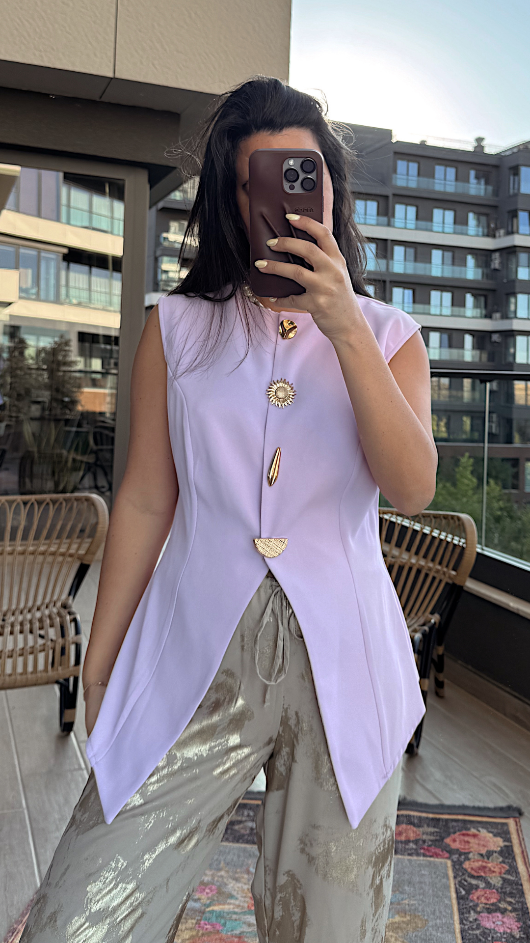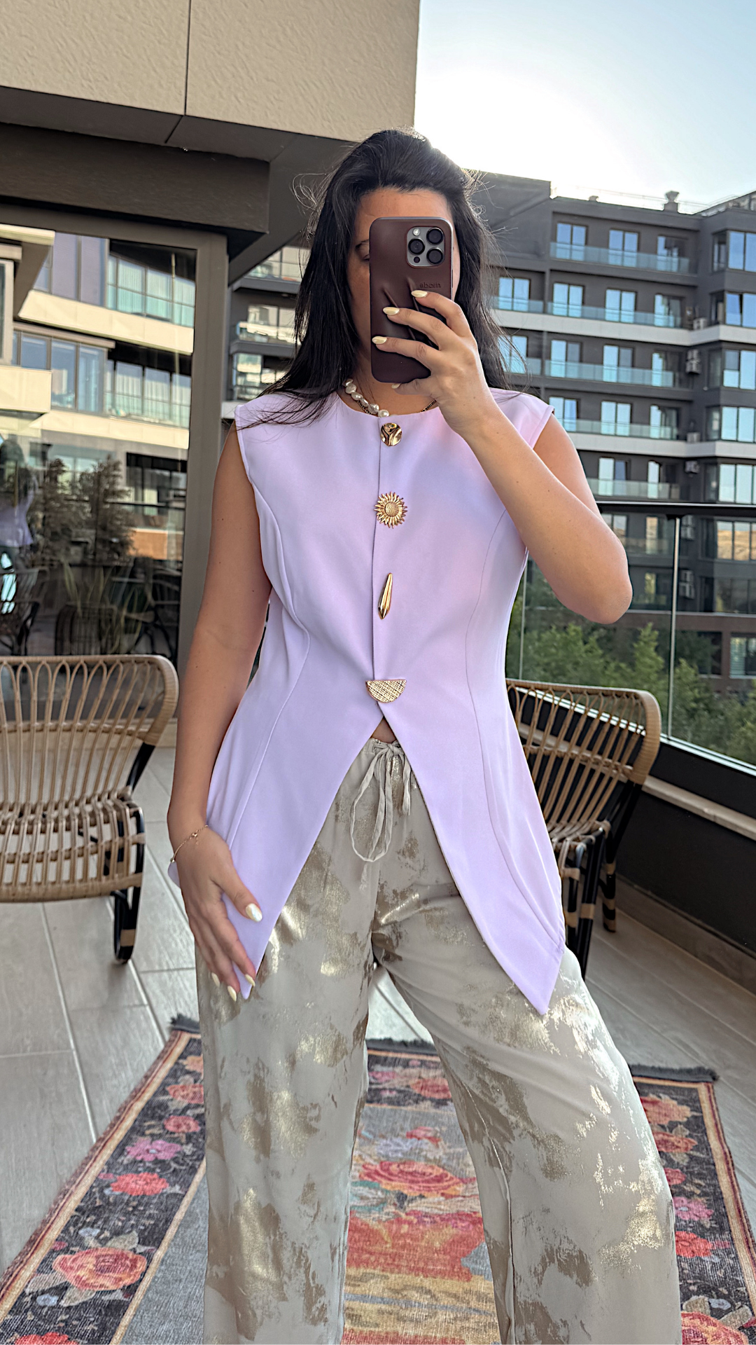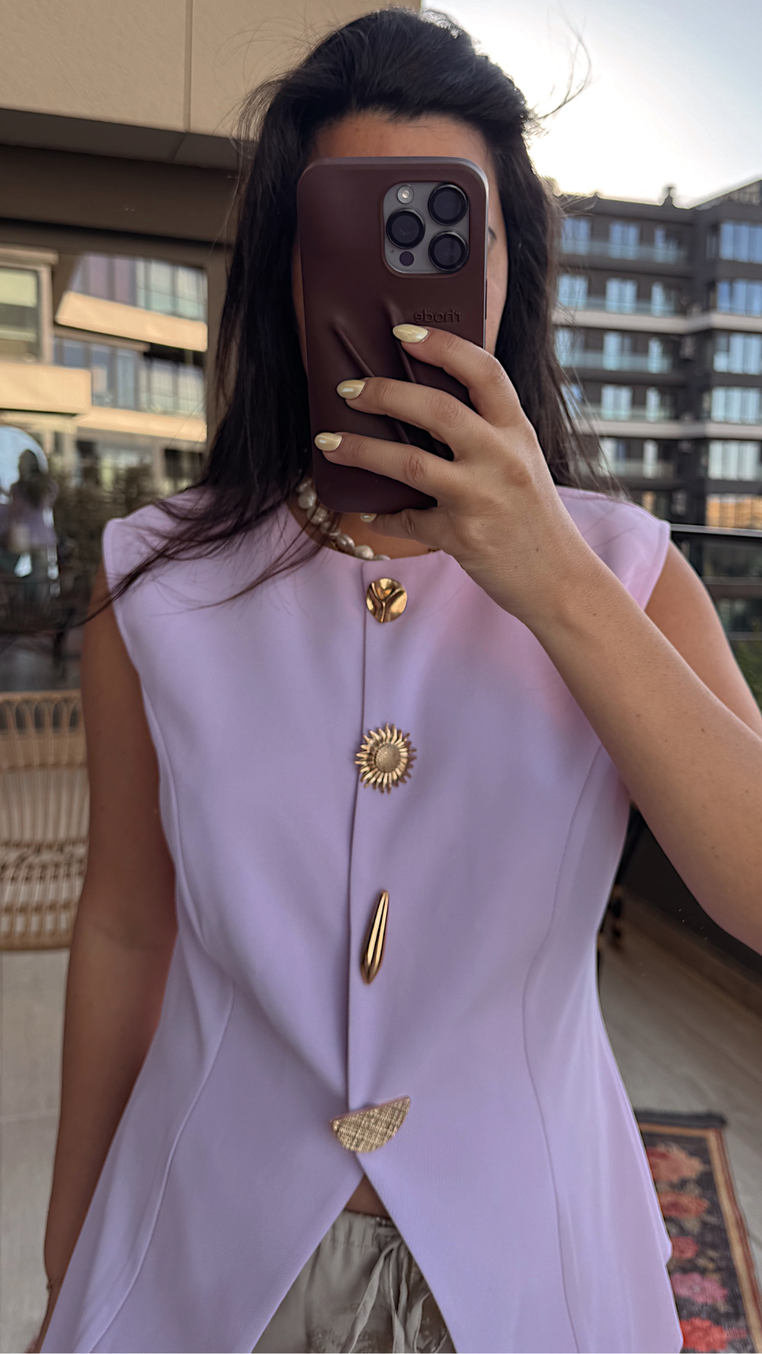 Aksesuar Düğmeli Bele Oturan Lila Yelek