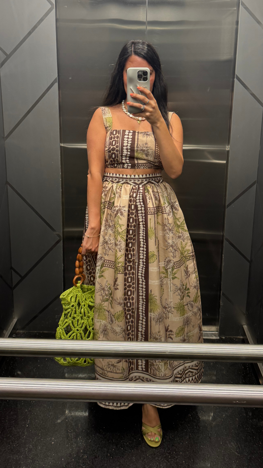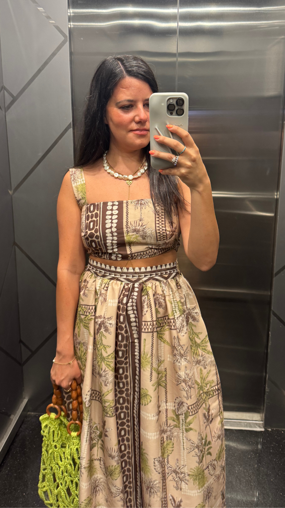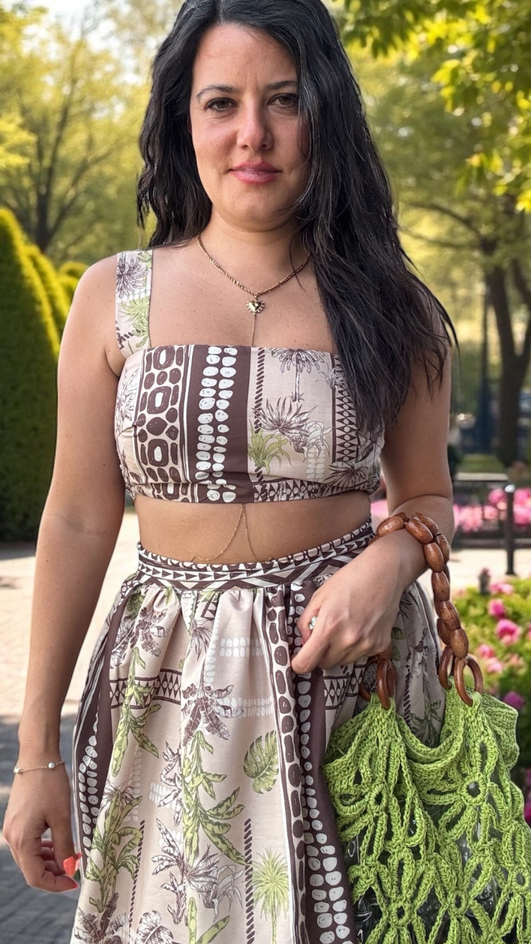 Amazon Desenli Takım crop bluz ve uzun etekten oluşur.