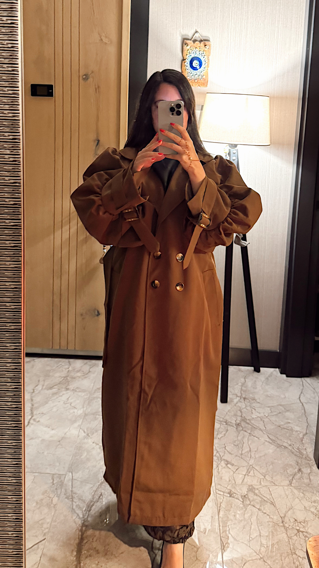 Balon Kol Kruvaze Yaka Uzun Trençkot -Kahverengi