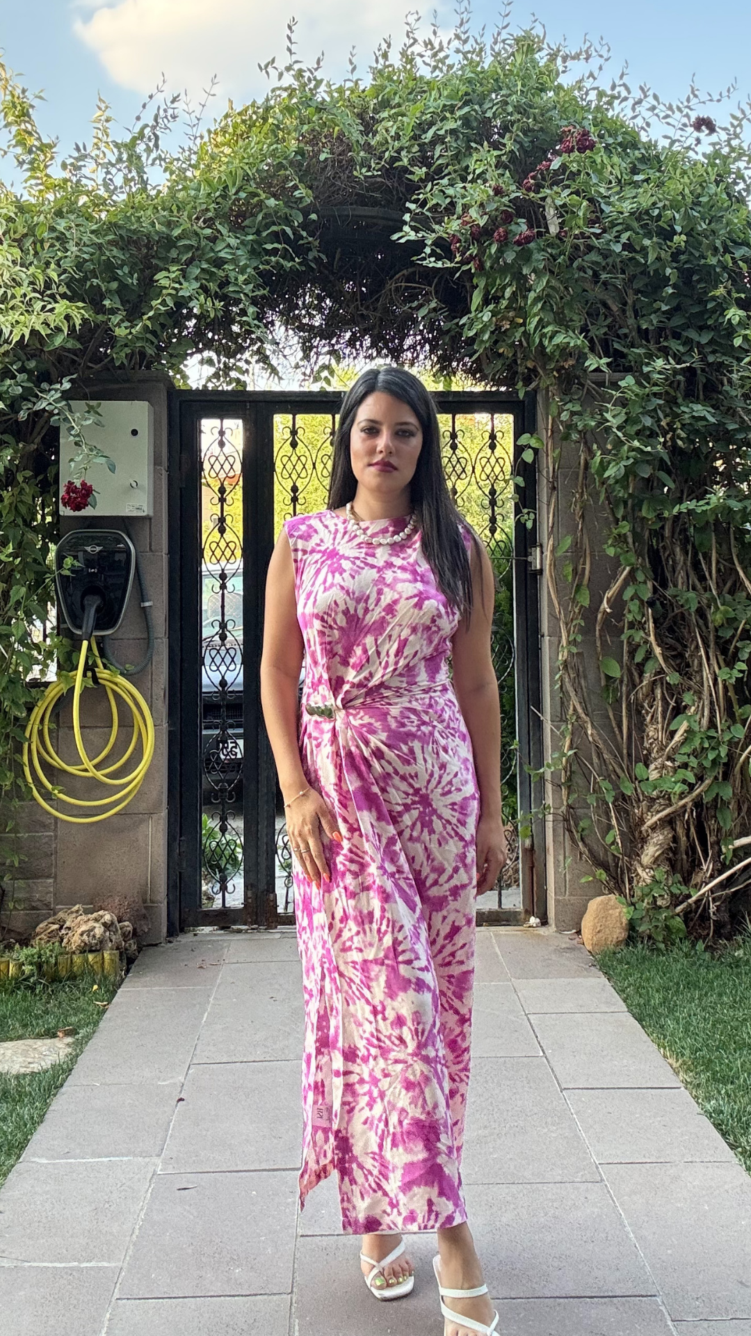 Batik Desenli Gold Tokalı Midi Elbise