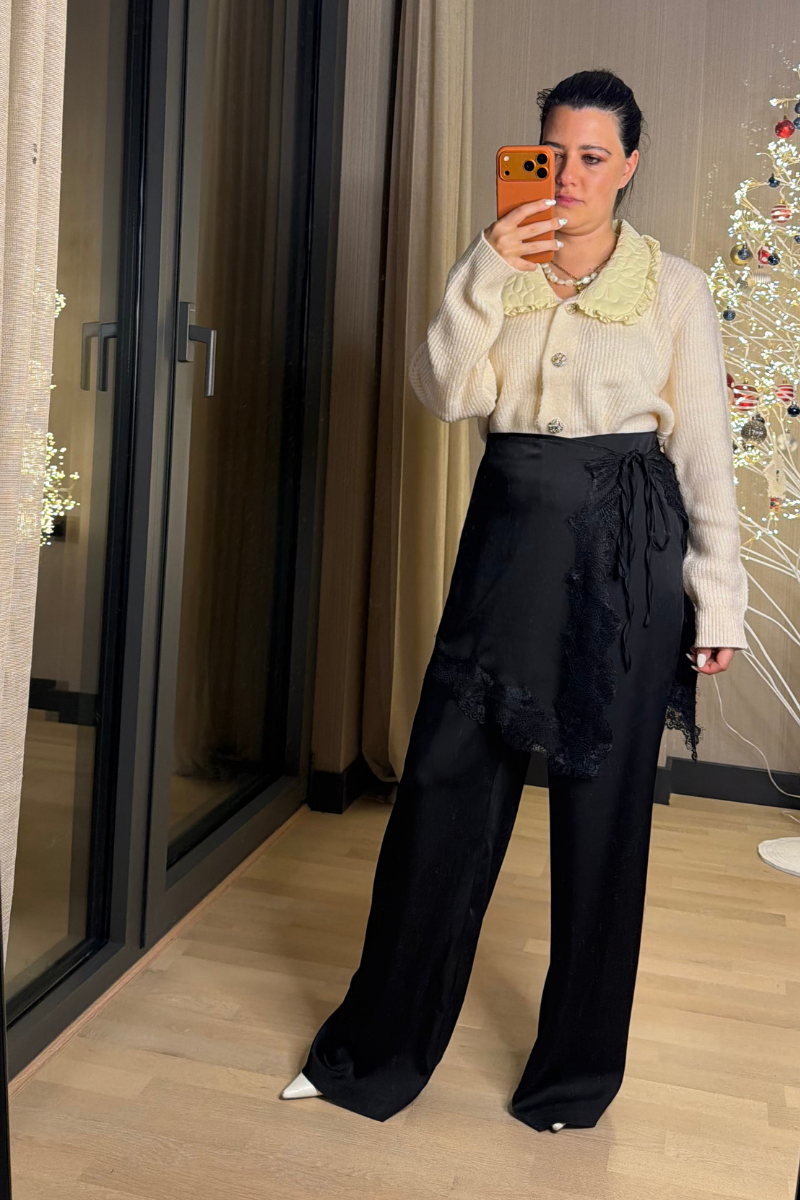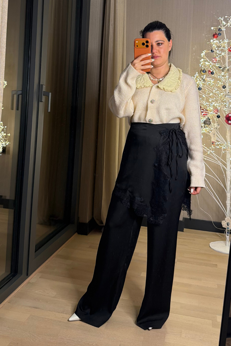 Bel Aksesuarlı Dantel Detaylı Saten Pantolon Siyah