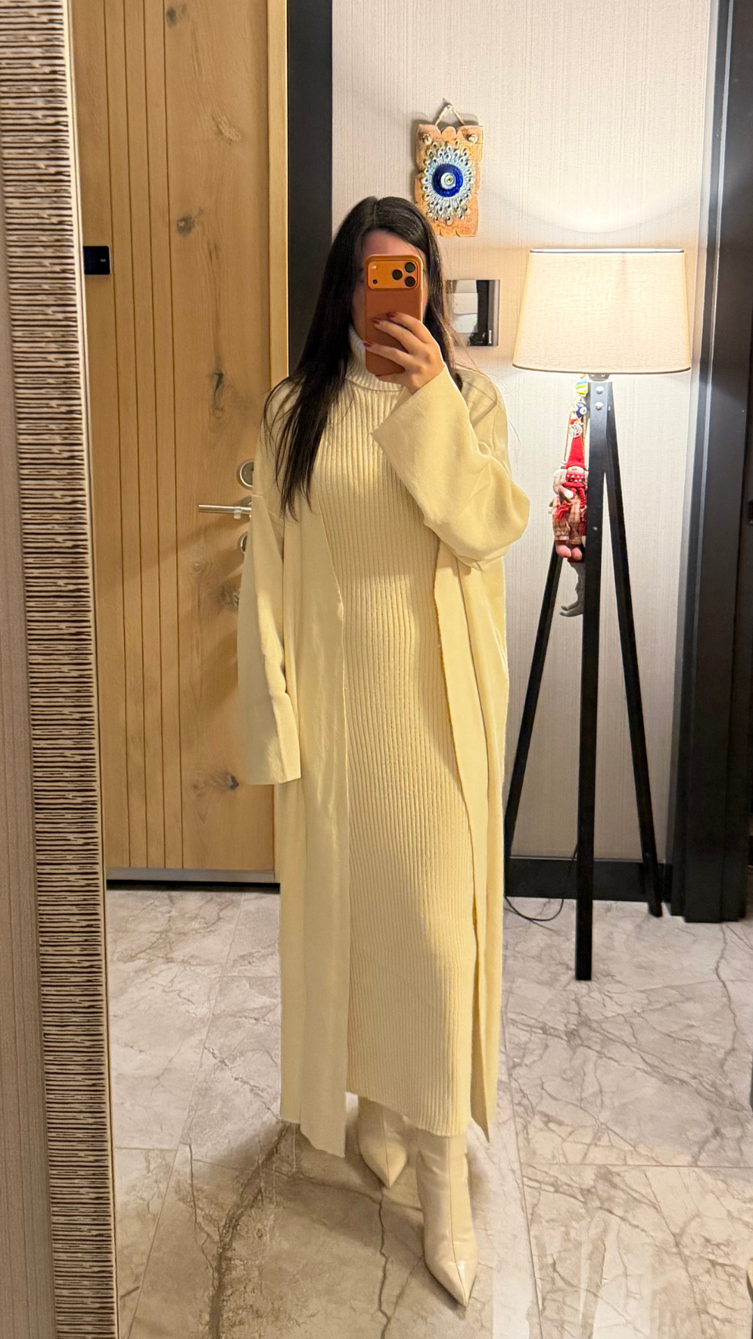 Boğazlı Elbise Hırka Triko Takım- Krem