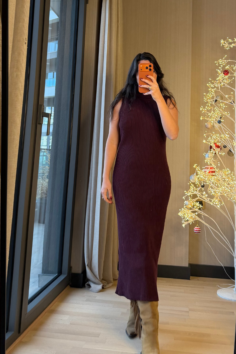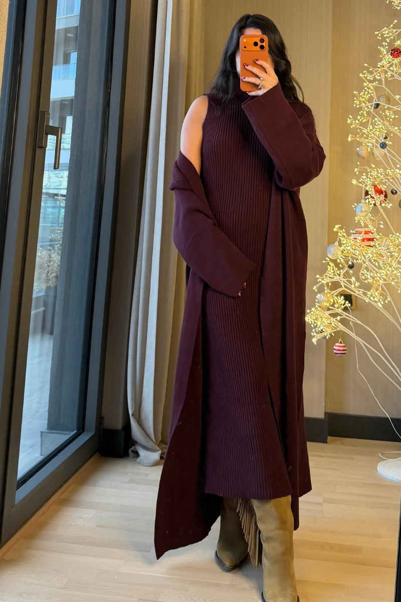 Boğazlı Elbise Hırka Triko Takım Mürdüm
