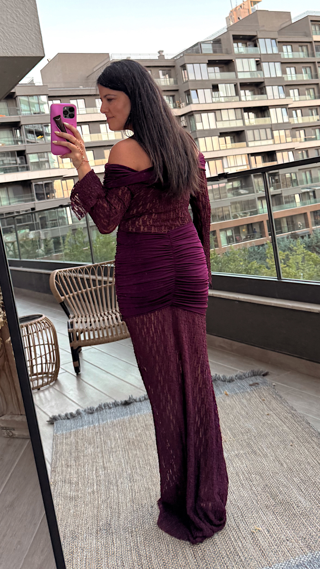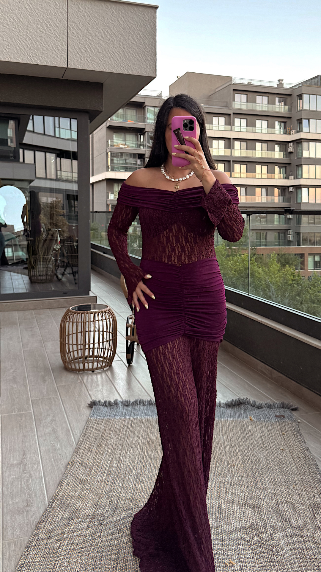 Bordo Dantel Detaylı Madonna Yaka Uzun Elbise