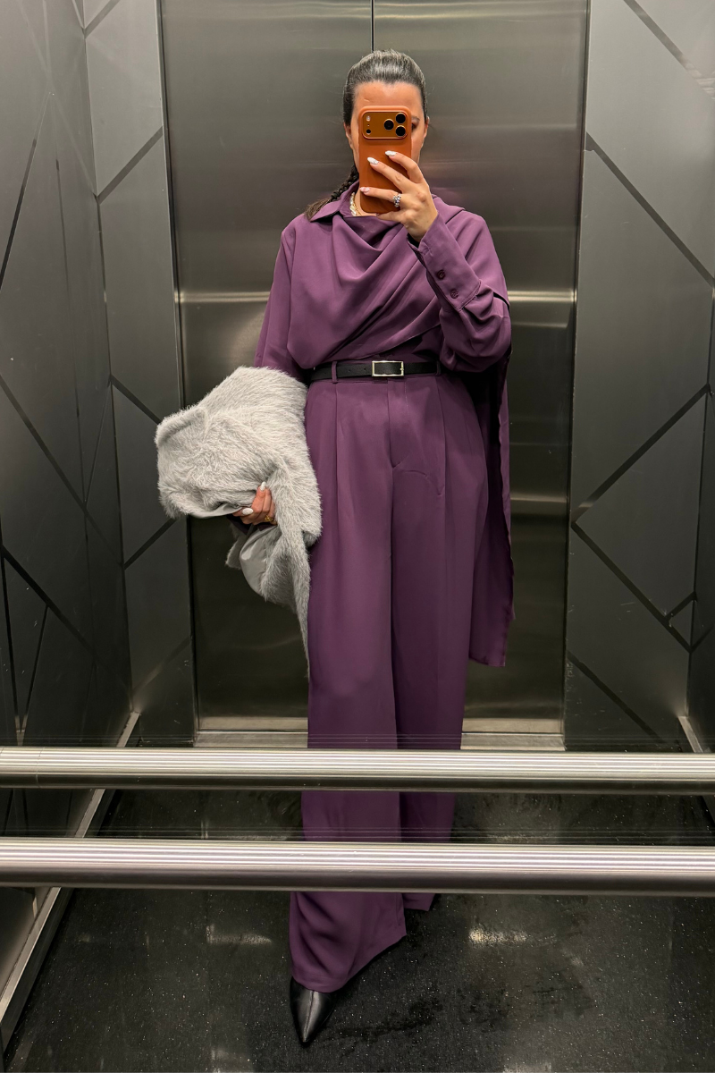 Boyun Şallı Gömlek Kemerli Pantolon Takım - Mor