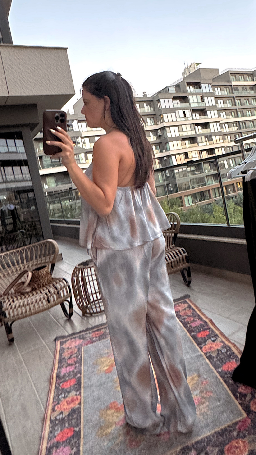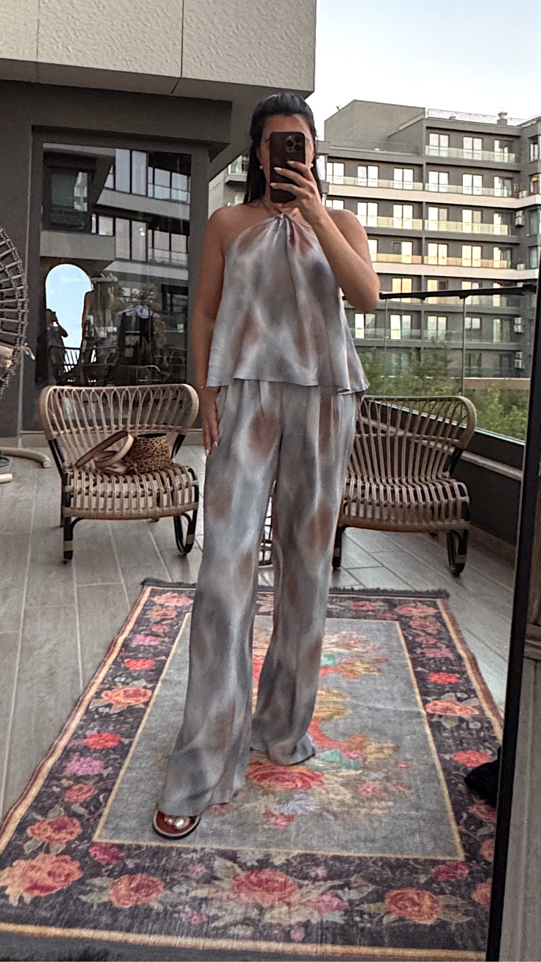Broş Detaylı Batik Takım beli lastiklidir. Boyundan bağlamalı bluzunun gül şeklinde broşu vardır.