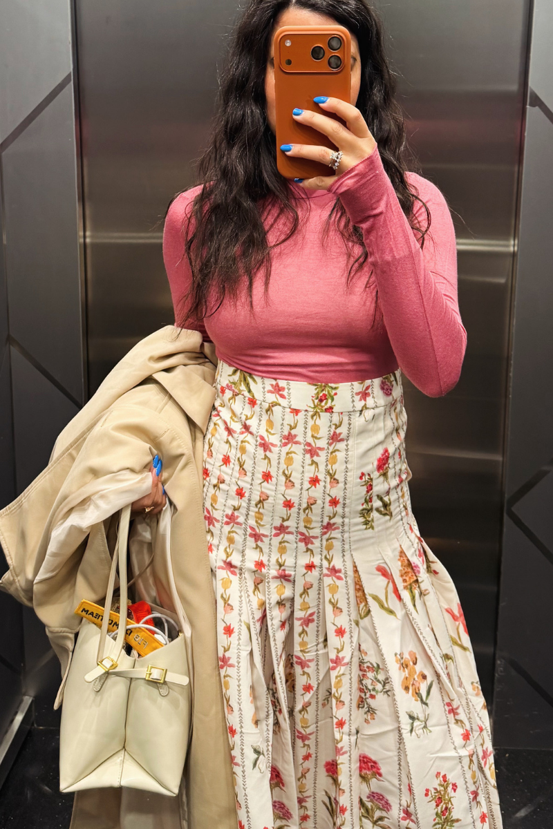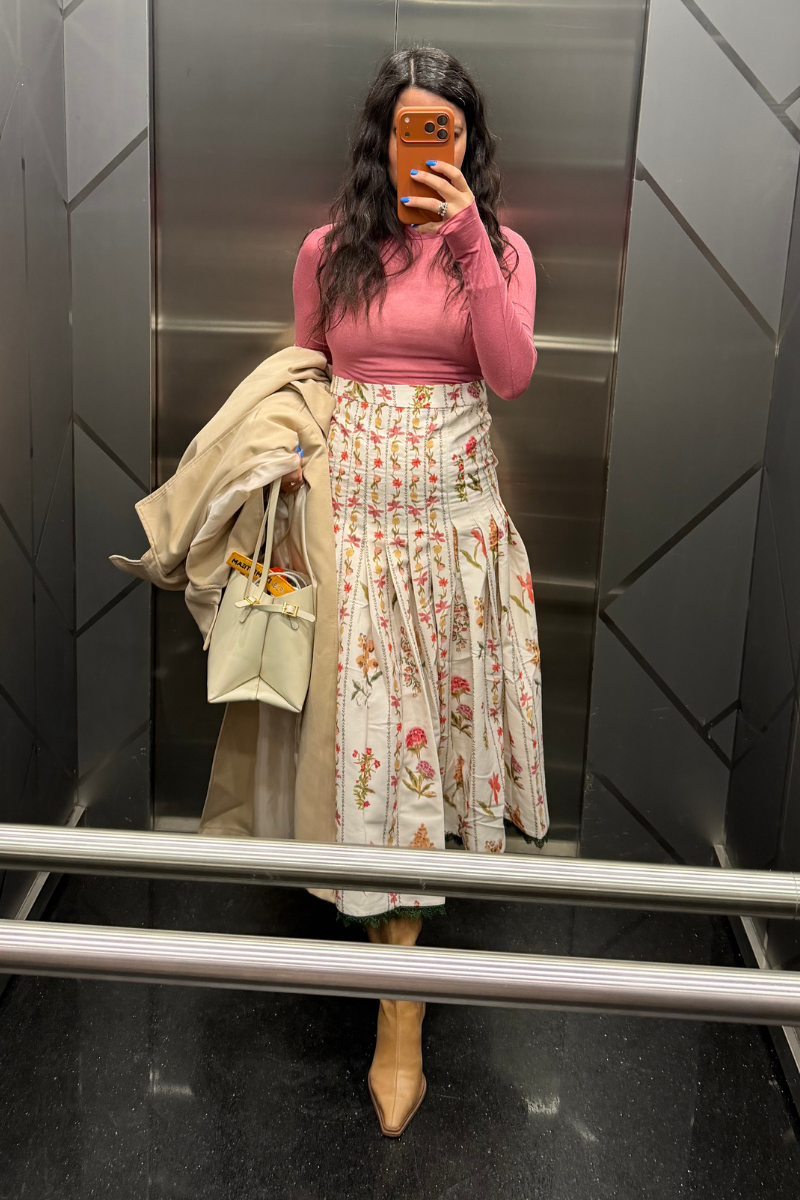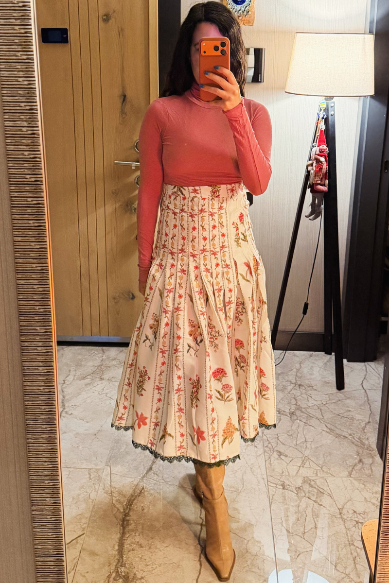 Çiçek İşlemeli Yüksek Belli Pilili Etek
