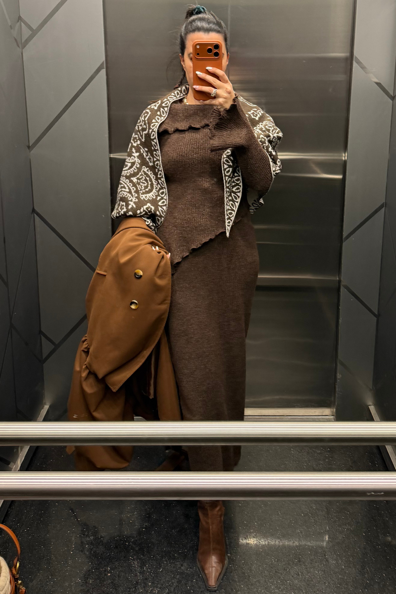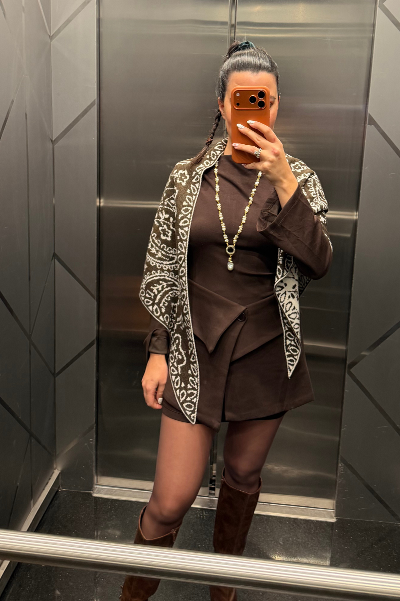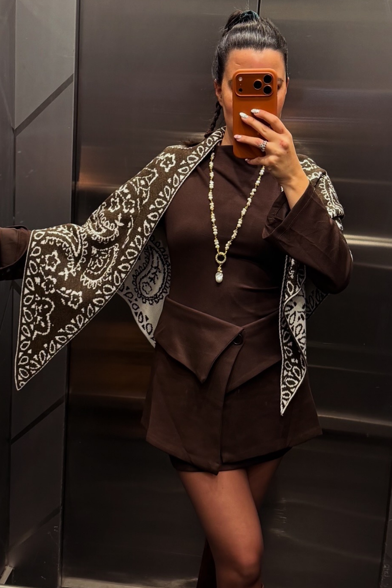 Çift Taraflı Şal, bir tarafı kahverengi, diğer tarafı krem renklidir.