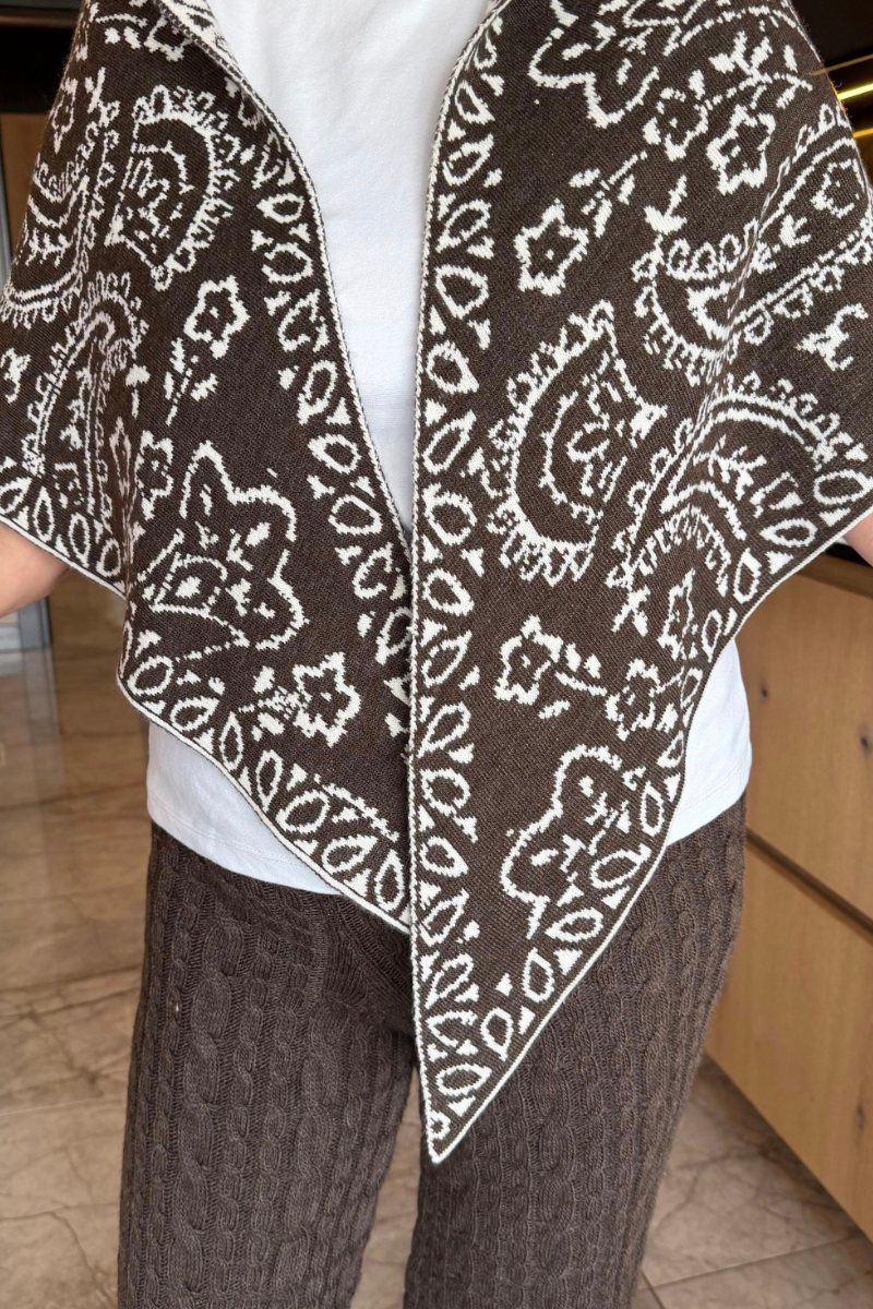 Kahve Melanj-Krem Çift Taraflı Desenli Triko Şal-Büyük Boy