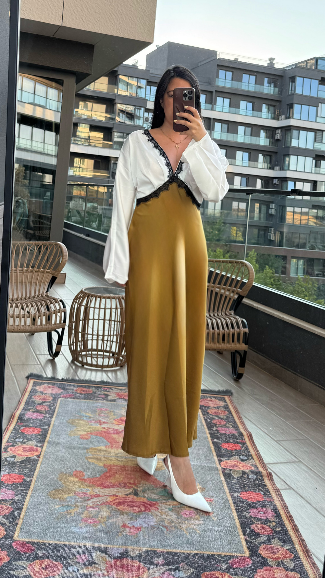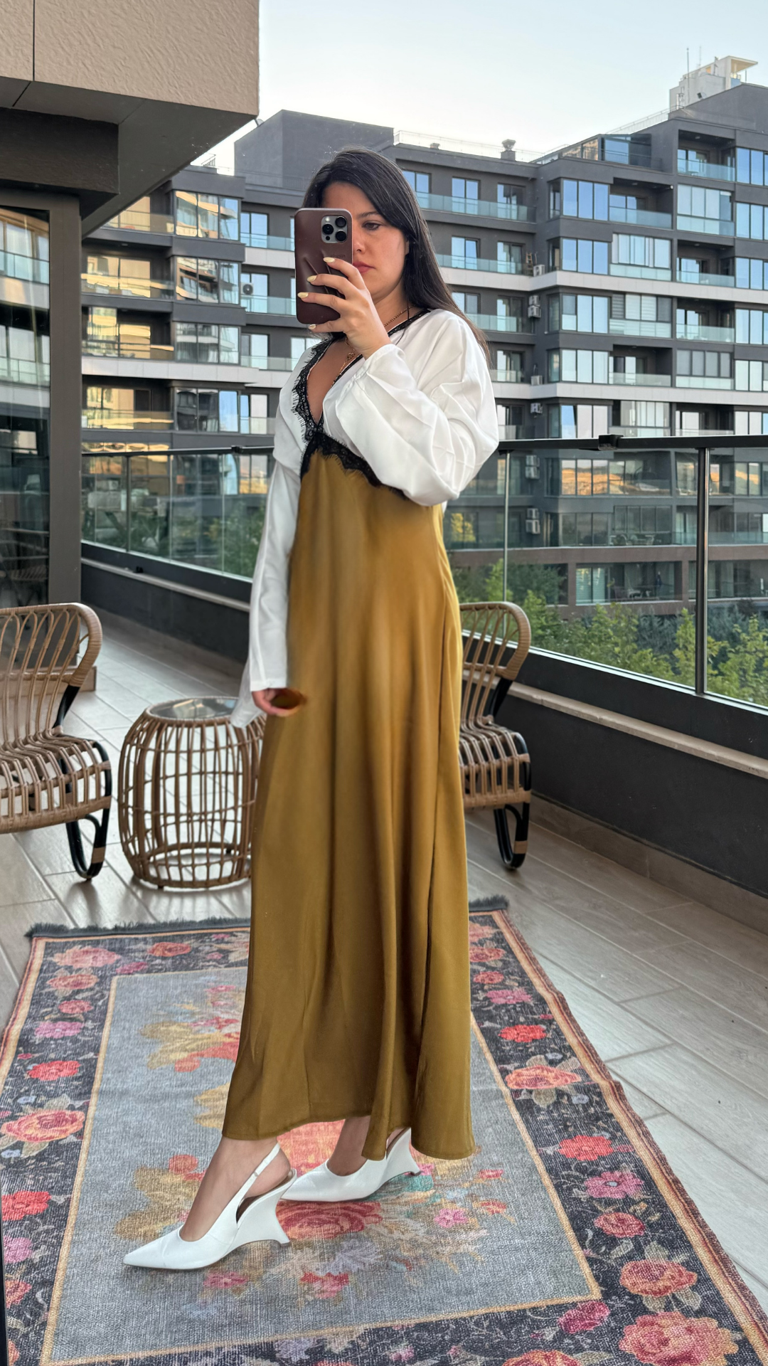 Dantel Detaylı Saten Elbise Yağ Yeşili