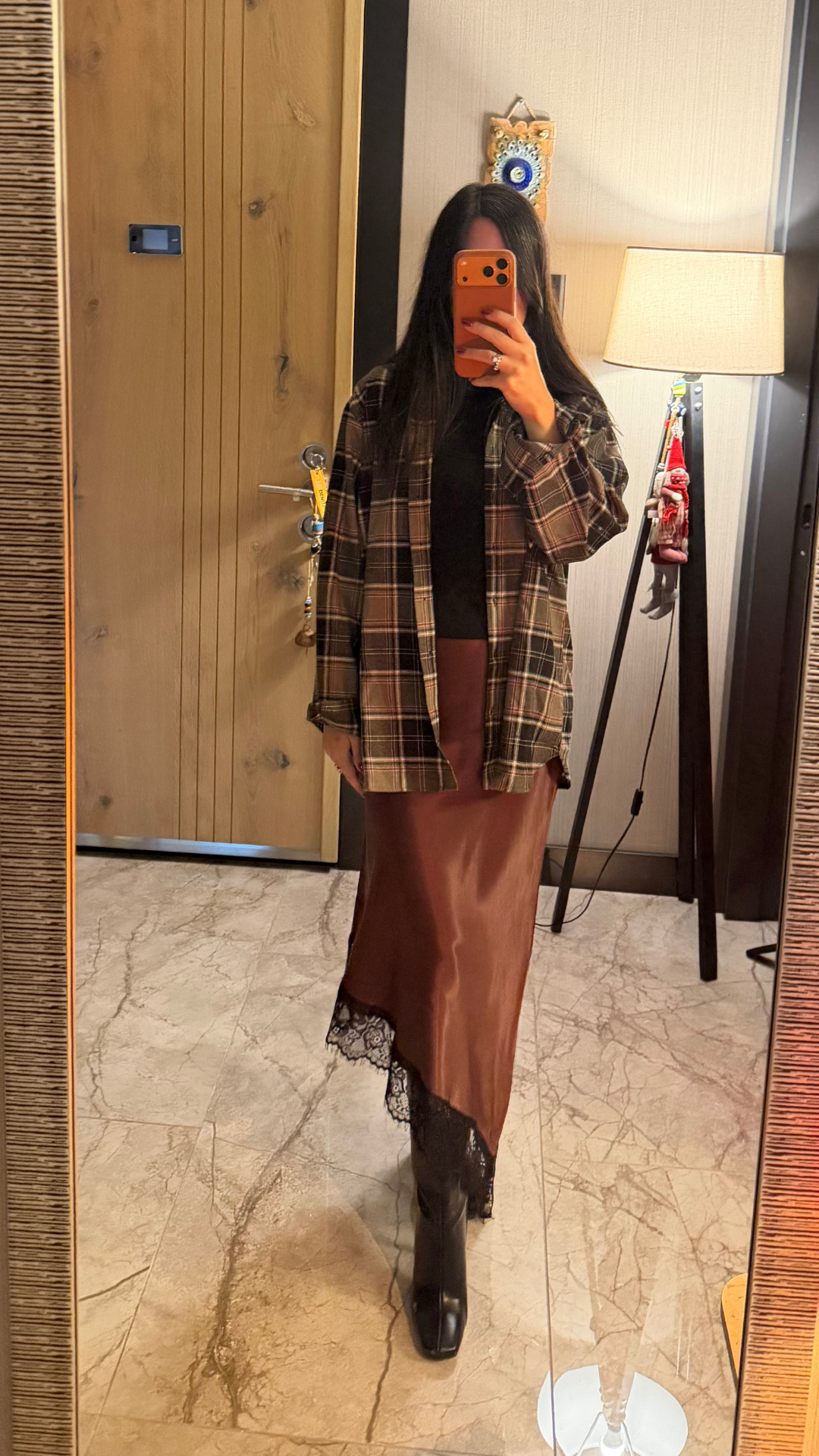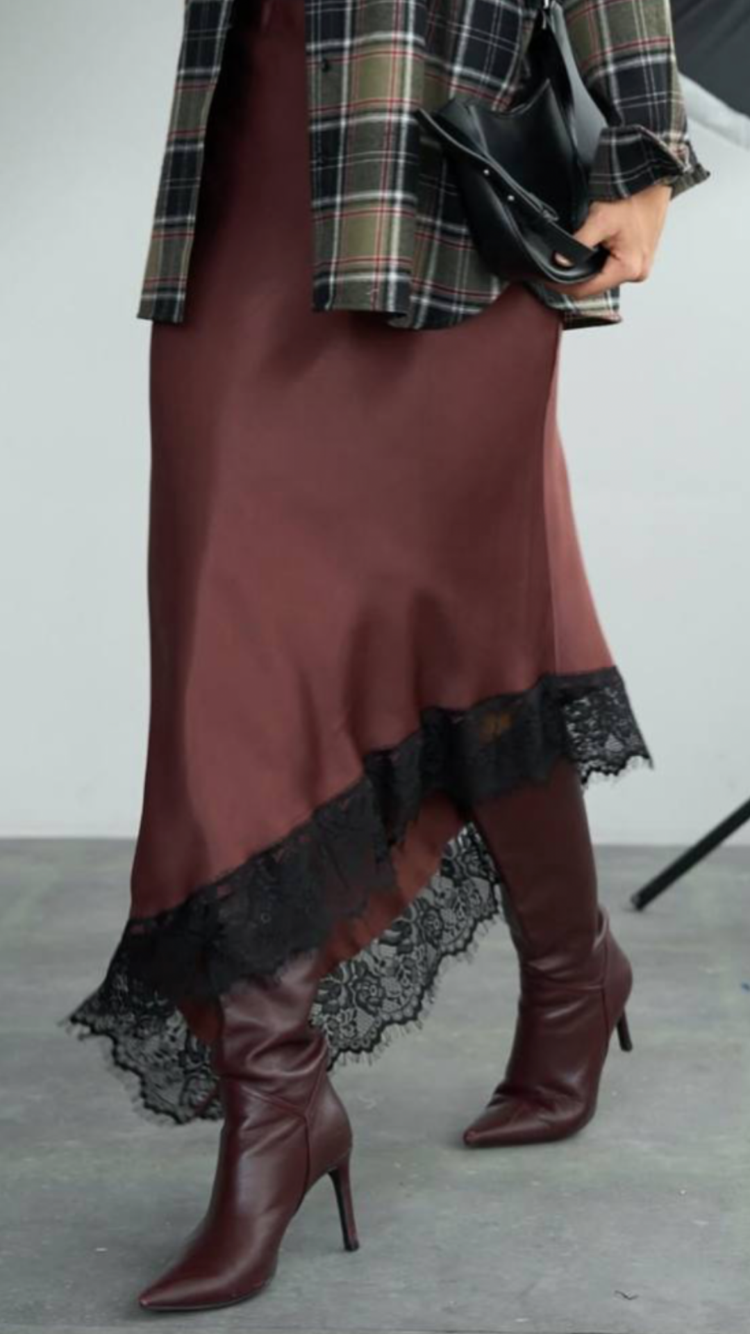 Etek ucu dantel detaylı, beli lastikli saten etek. İç göstermez.