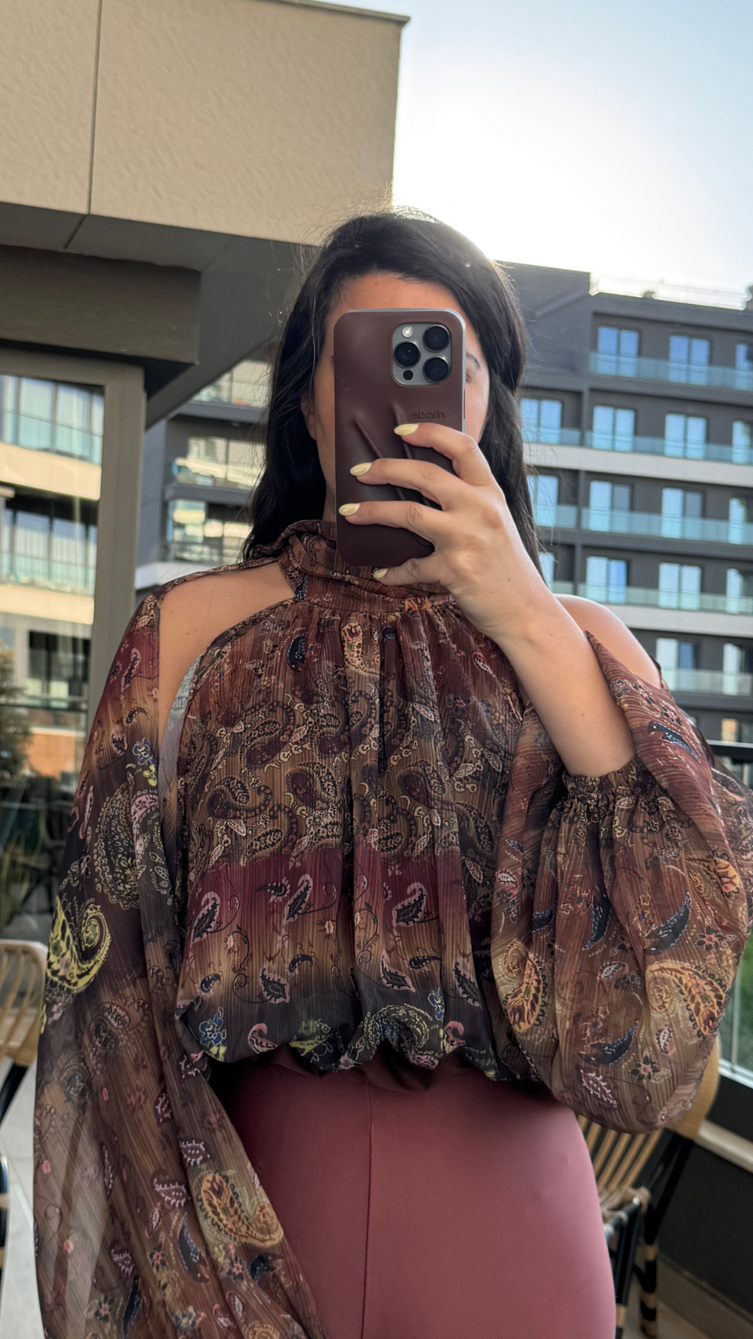 Desenli Omuz Dekolteli Kahverengi Şifon Bluz