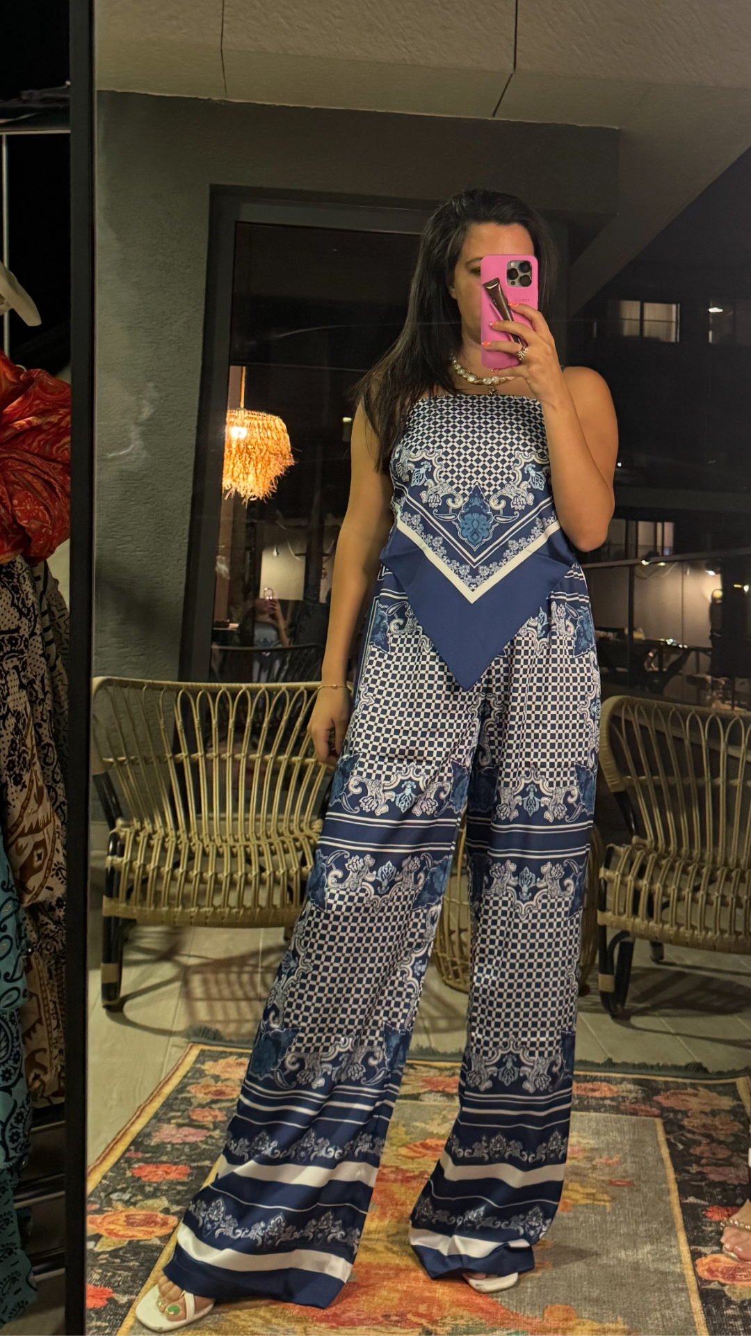 Desenli Üçgen Bluz Pantolon Takım üst bluzu sırttan bağlamalıdır. Askıları ayarlanabilir.