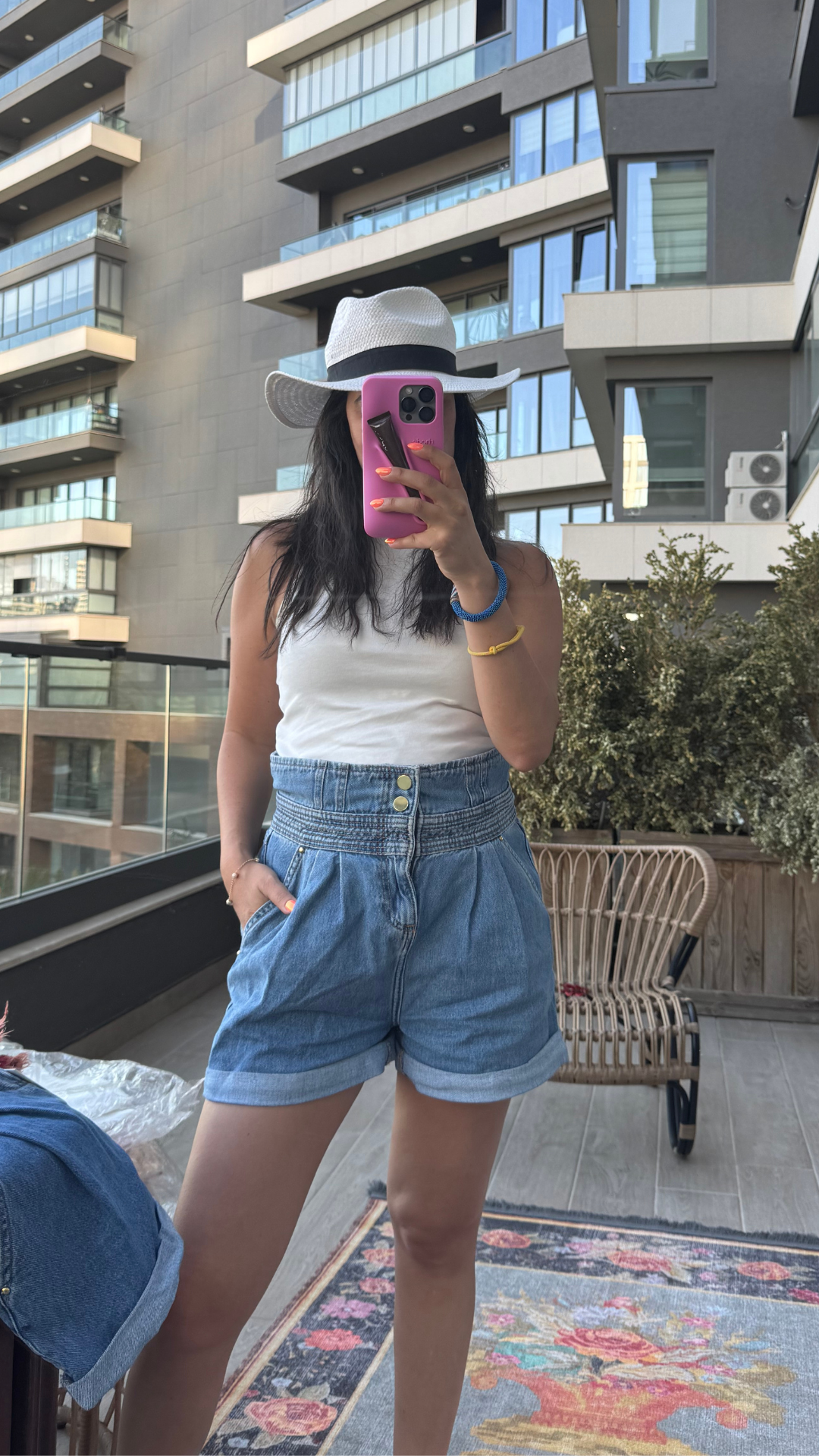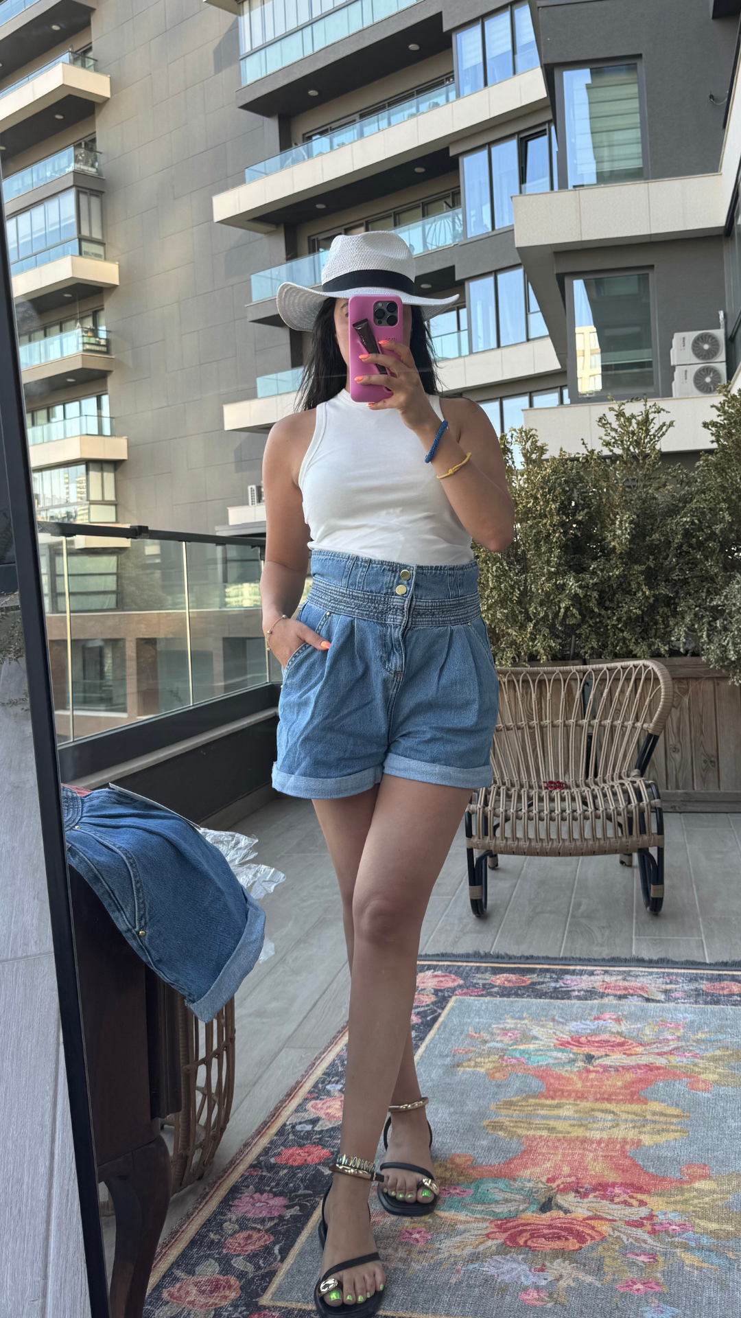Düğmeli Koyu Renk Şort Yüksek beldir. Tam kalıptır.