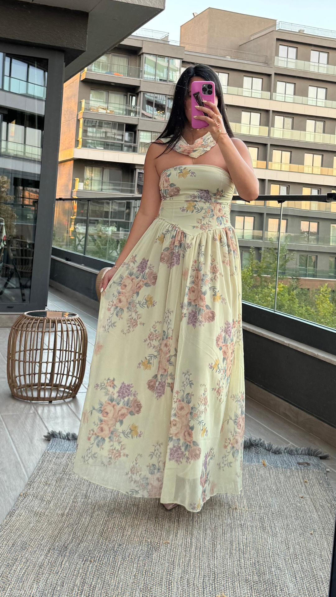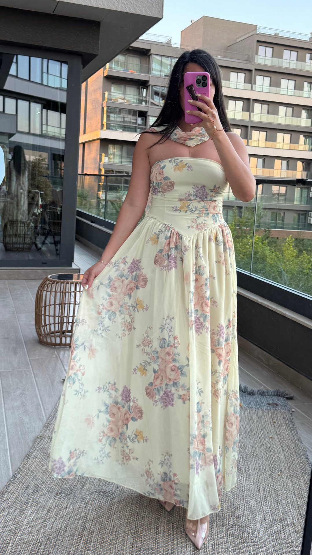 Sarı straplez çiçek desenli, sırttan fermuarlı elbise, boyun aksesuarıyla gelecektir.