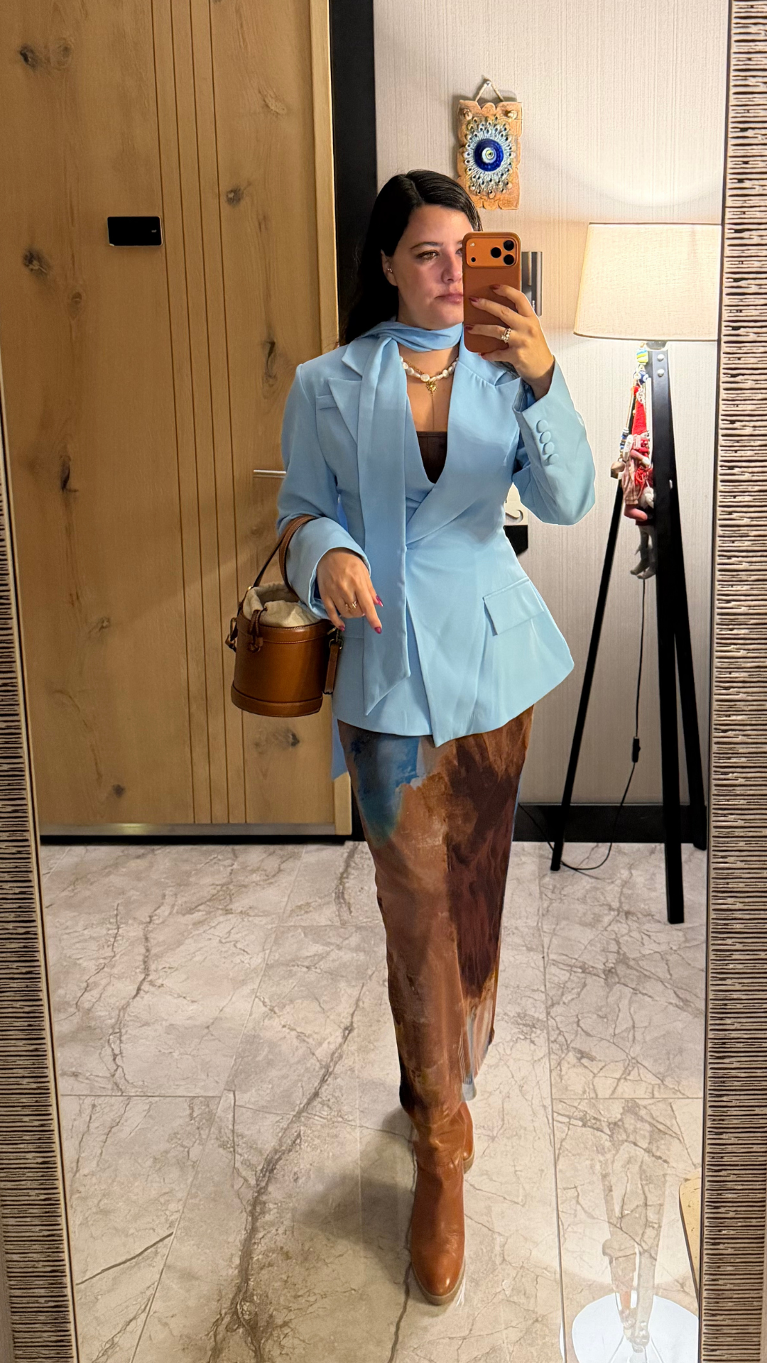 Bele oturur, iç düğmesi vardır. Fularla birlikte gelir.