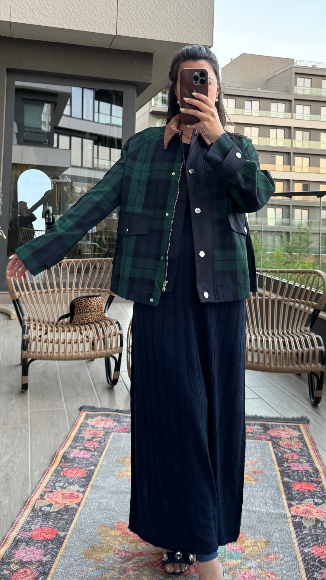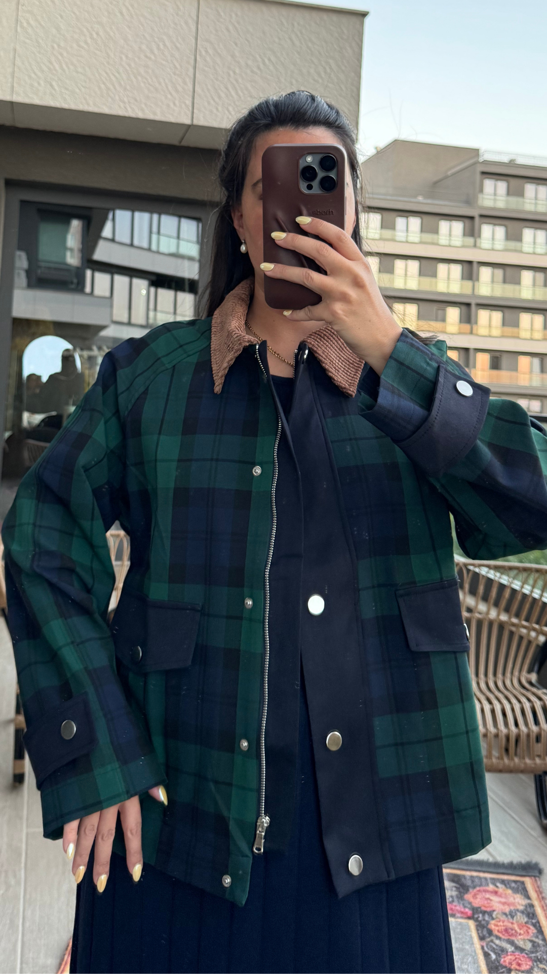 Kadife Yakalı Yeşil Ekoseli Ceket çıt çıt düğmeli ve fermuarlıdır.