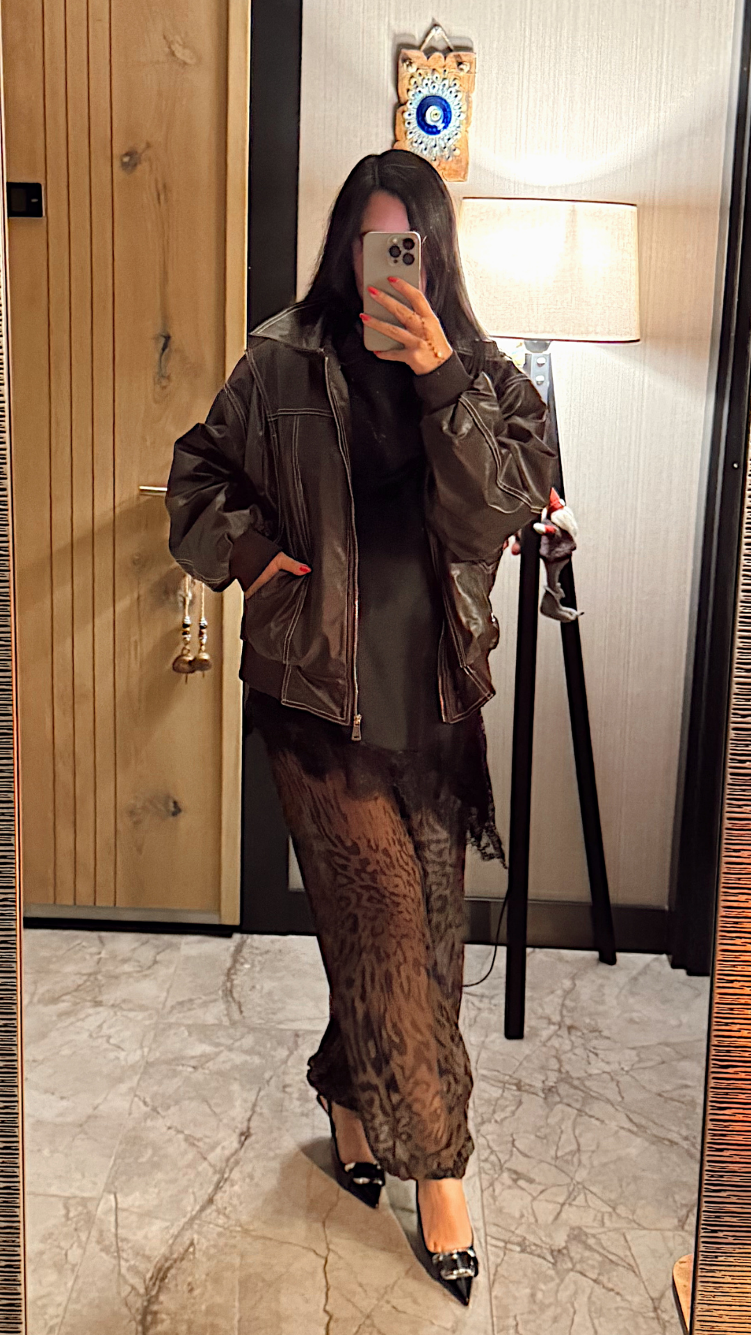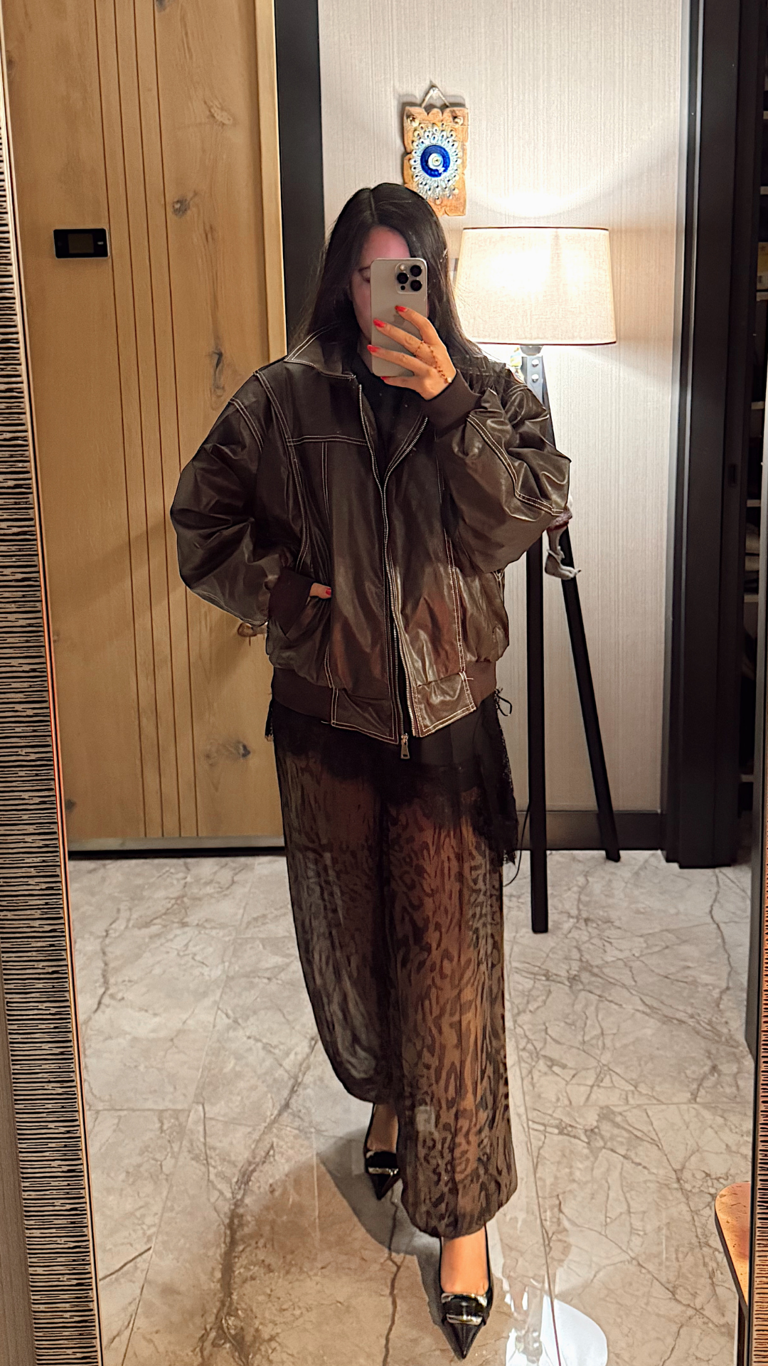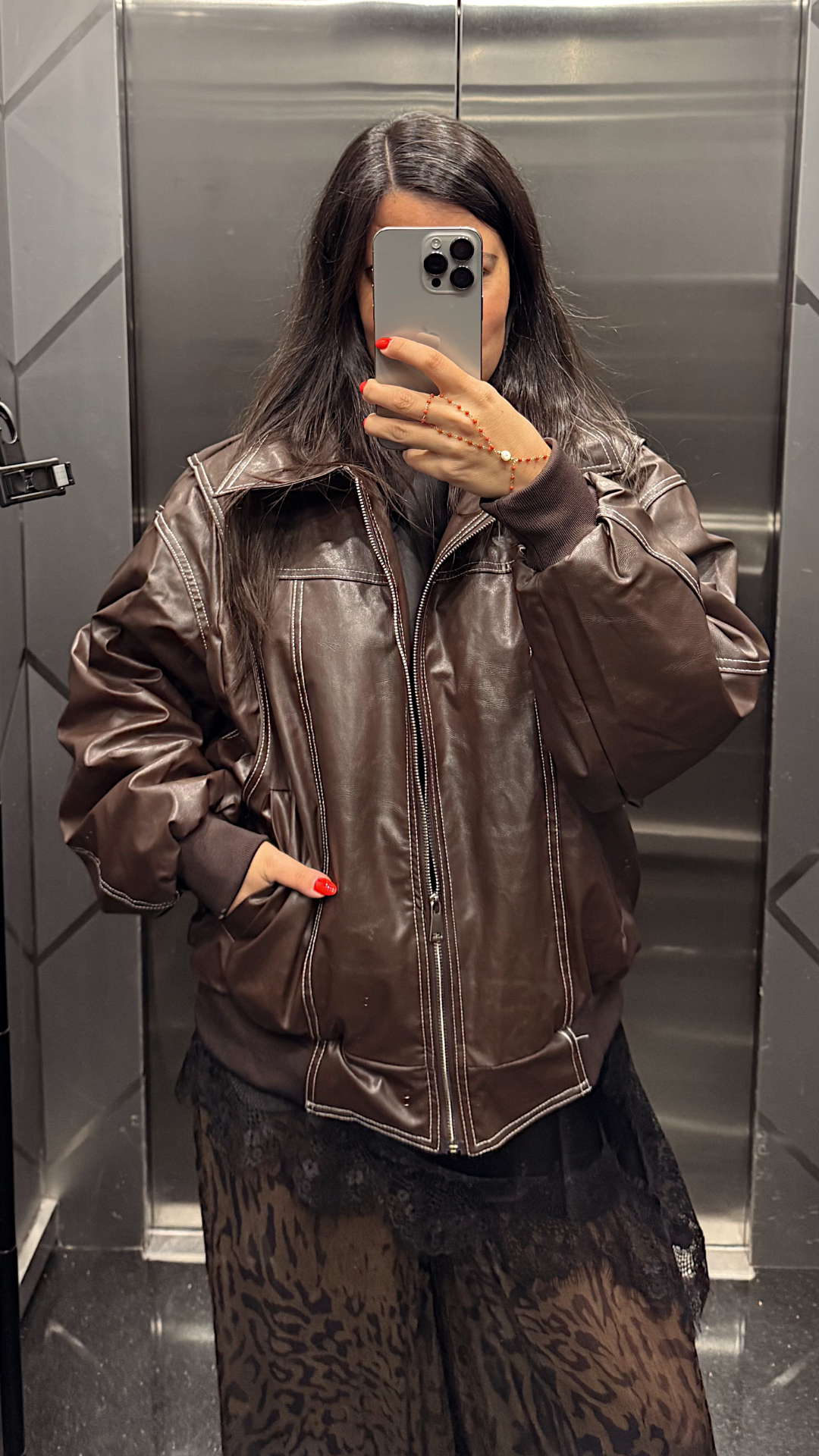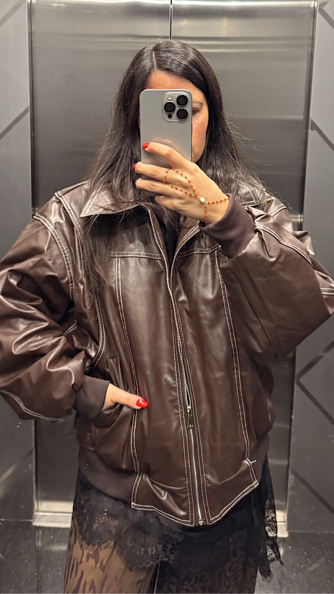 Kahverengi Dikiş Detaylı Astarlı Deri Ceket