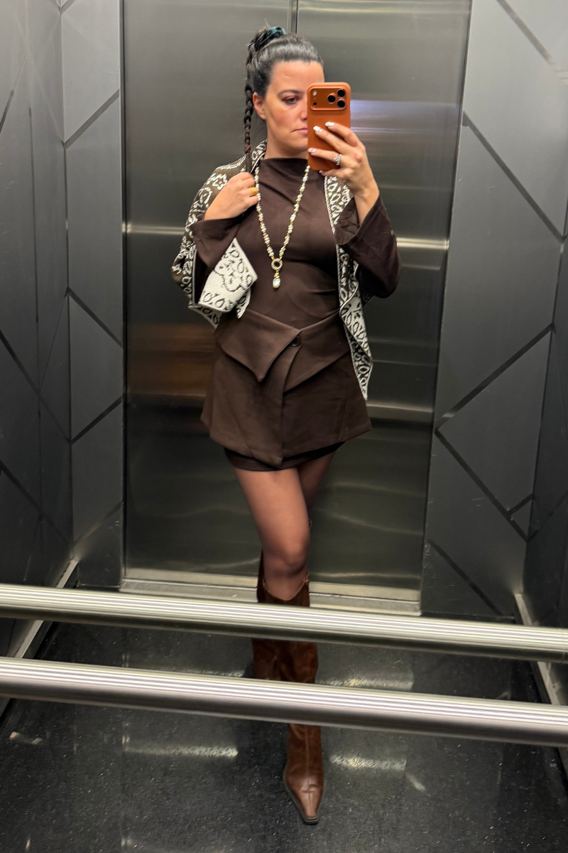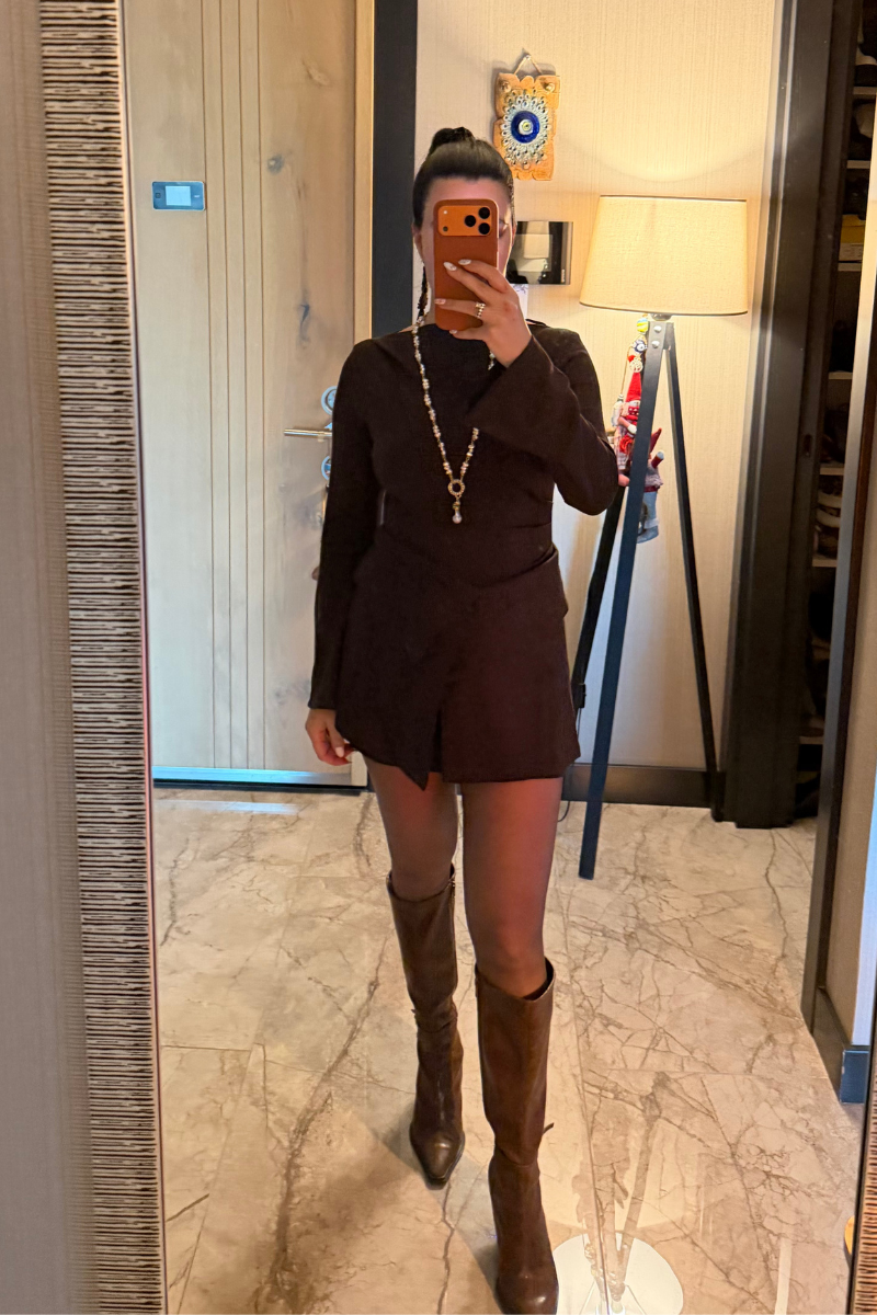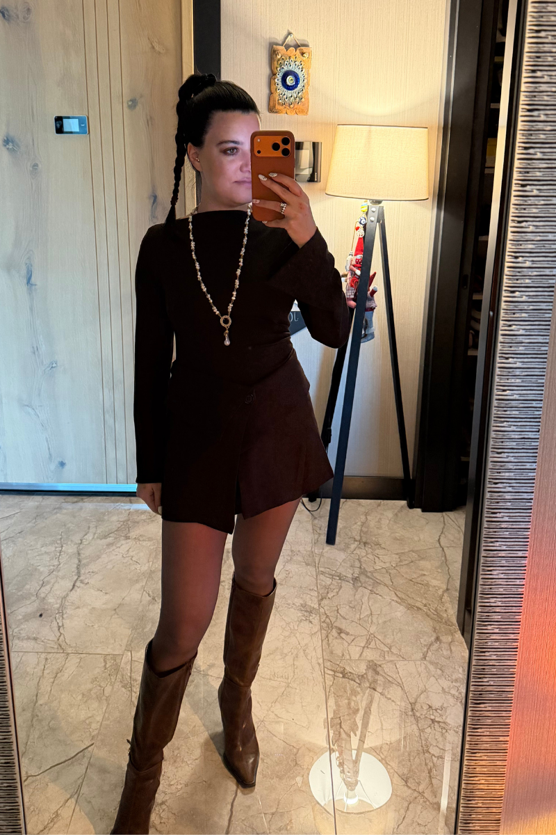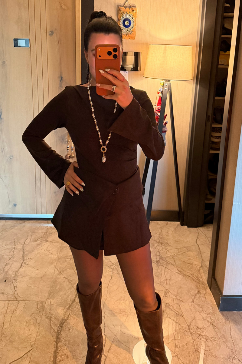 Kahverengi Etek Parça Detaylı Mini Elbise