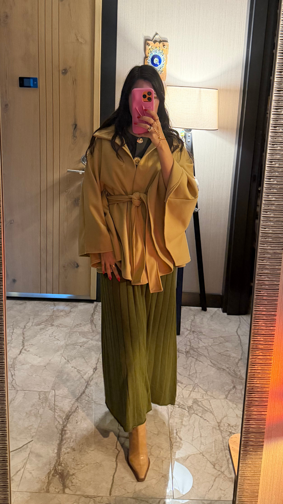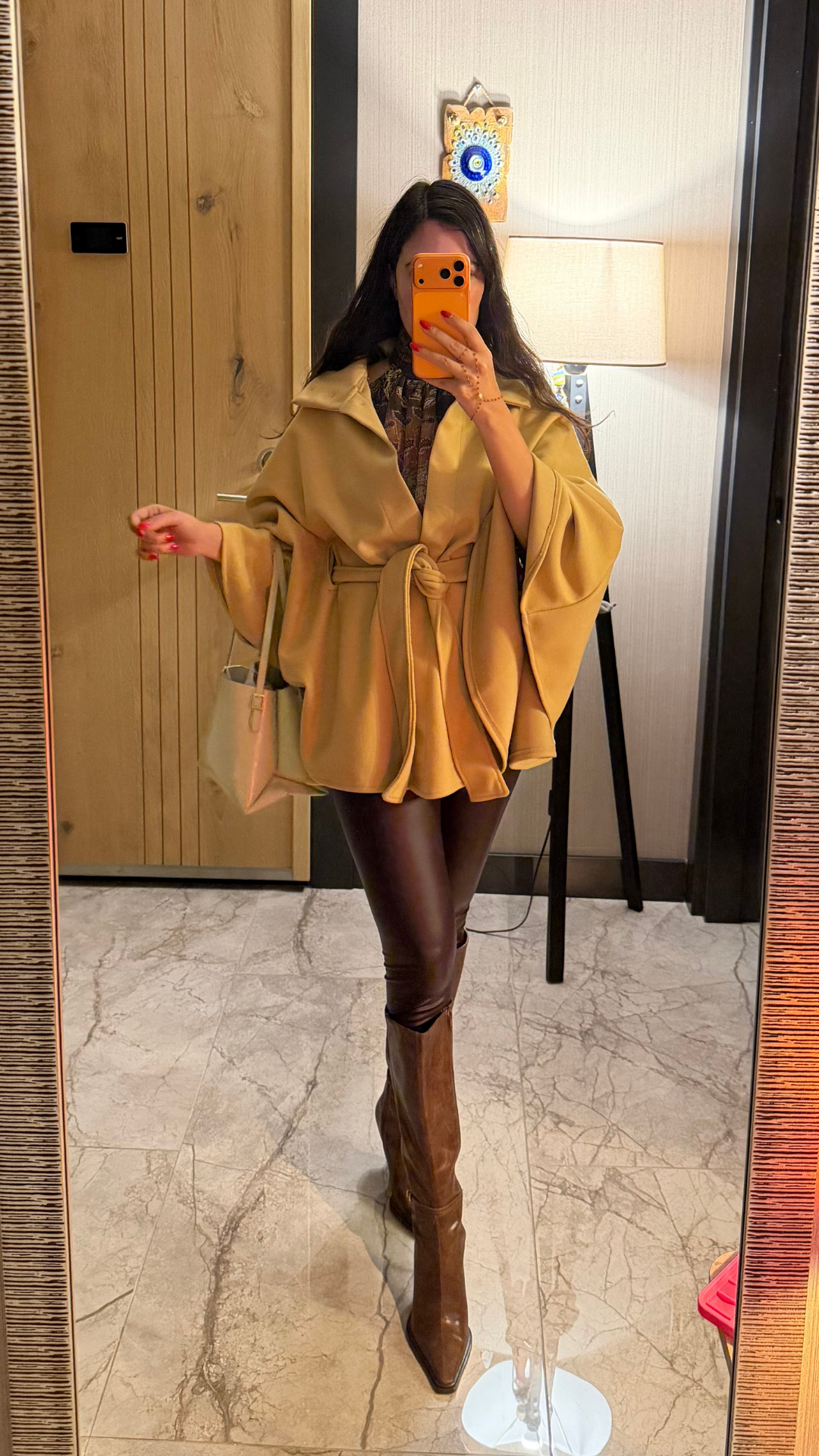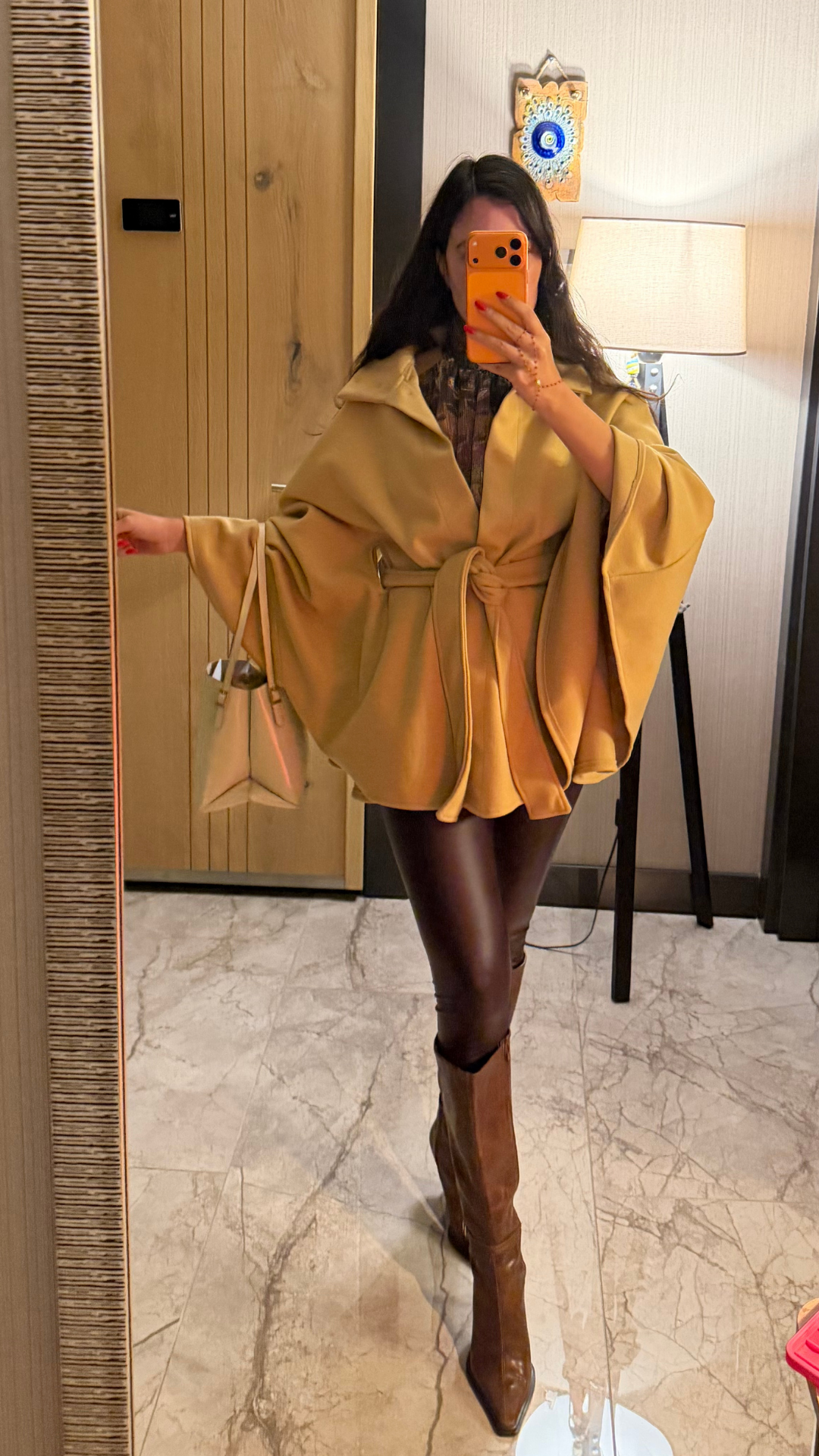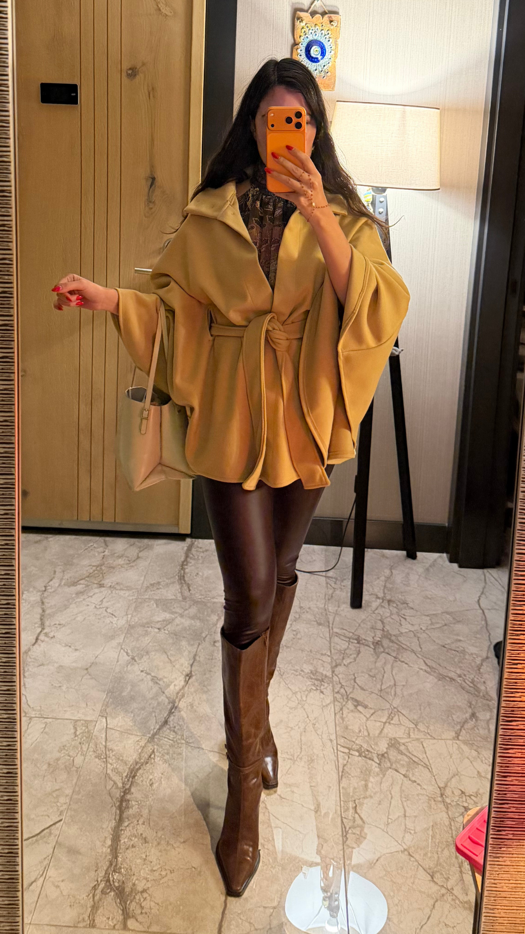 Kemer Detaylı Kaşe Panço bağlamalı kemeriyle beli daha ince gösterir.