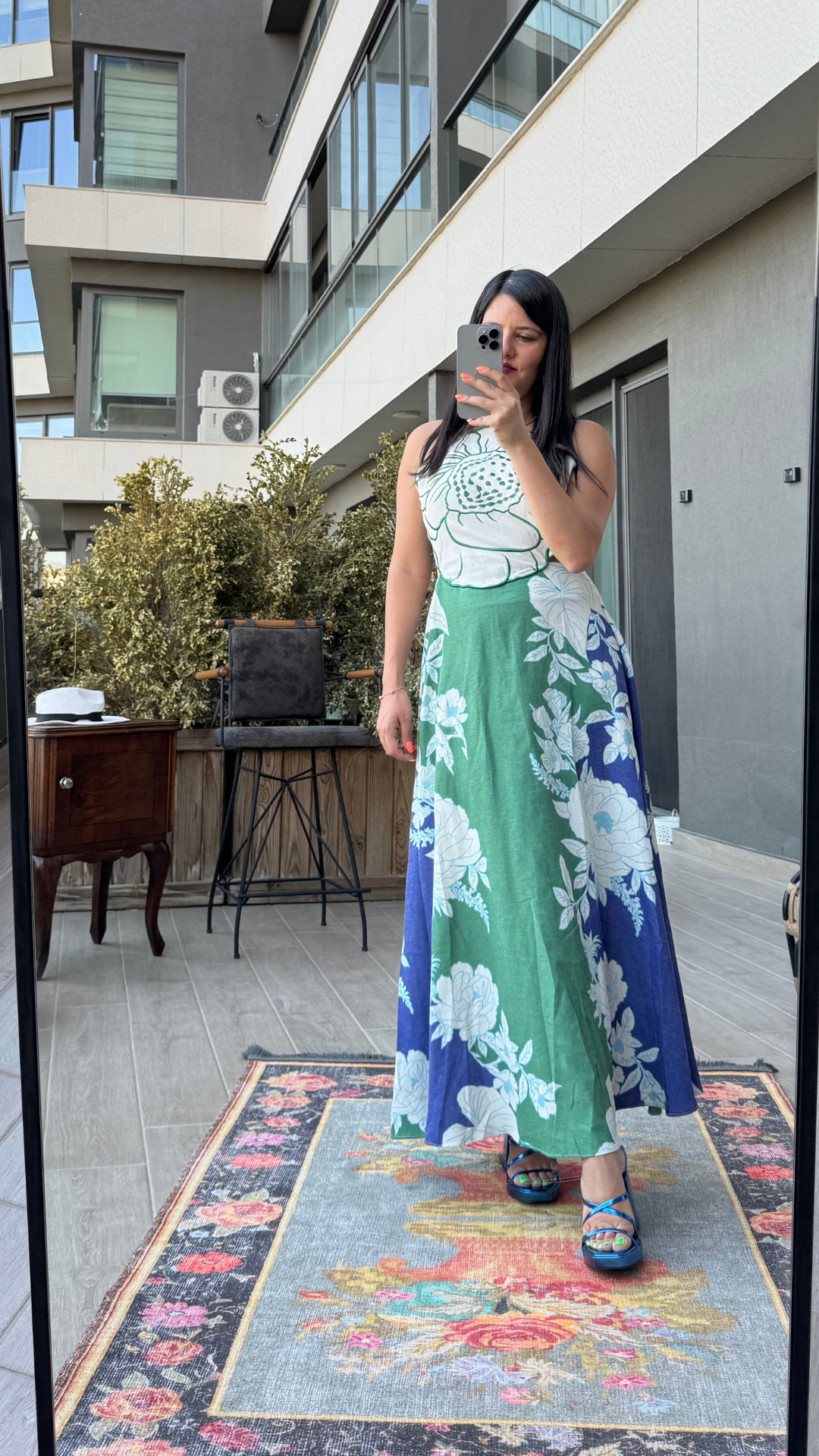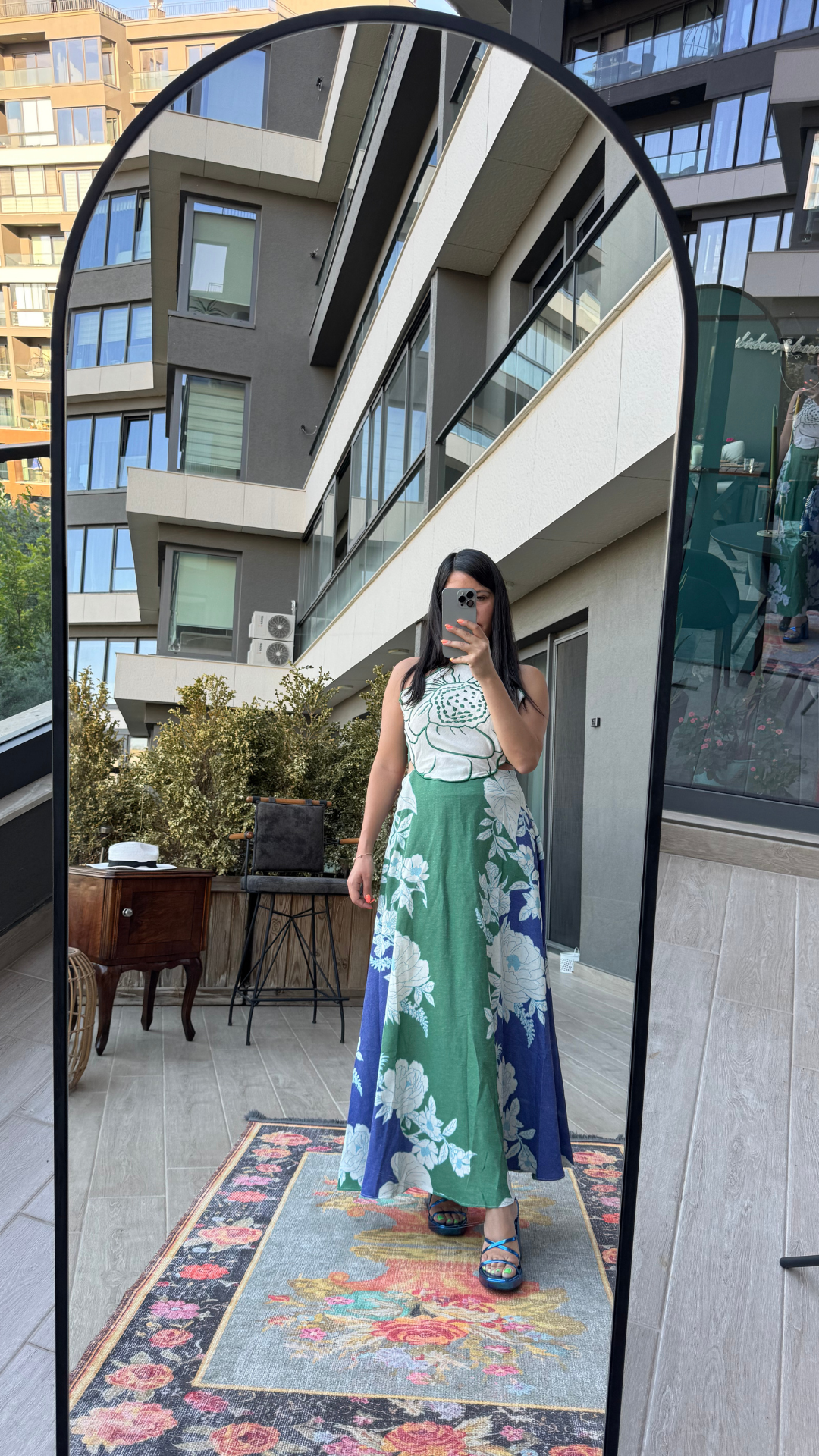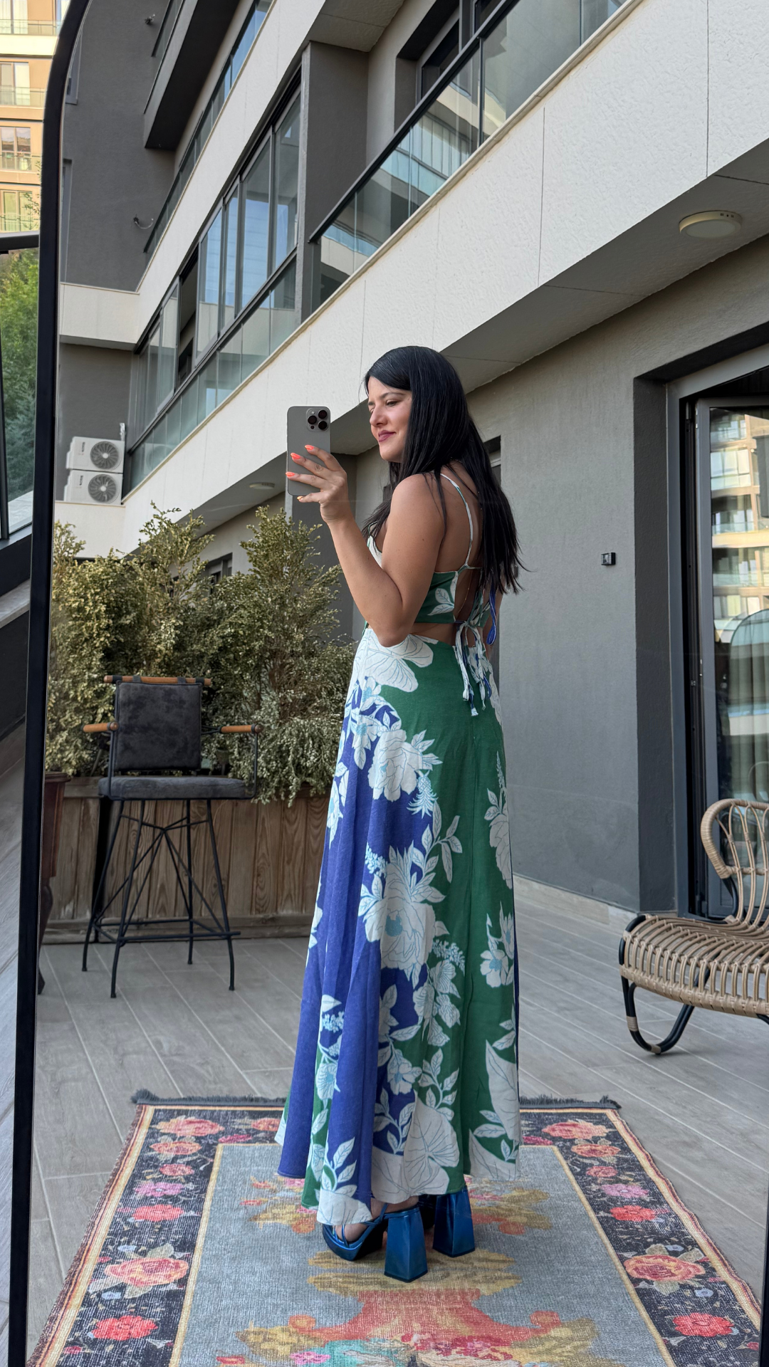 Keten Sırt Dekolteli Floransa Elbise Mavi Yeşil