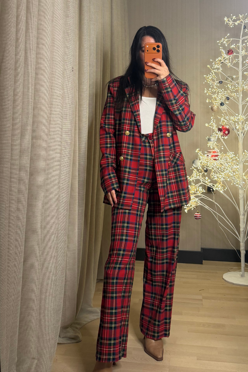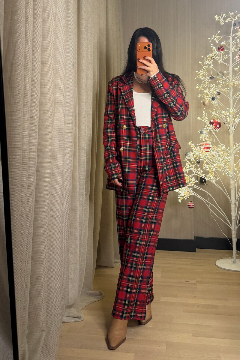Kırmızı Ekoseli Oversize Blazer gold düğme detaylıdır.