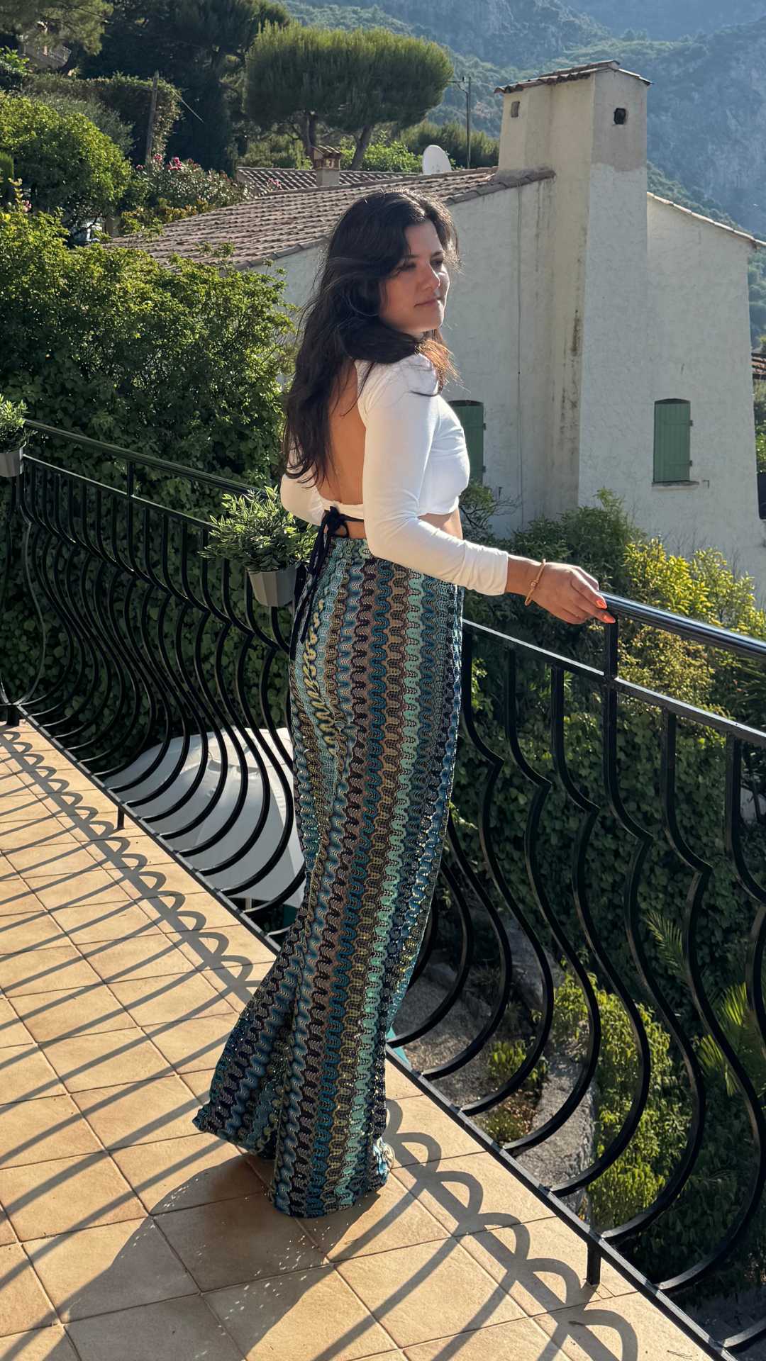 Kroşe Örgü Pantolon Takım Boyundan ve sırttan bağlamalı üçgen örgü büstiyer.