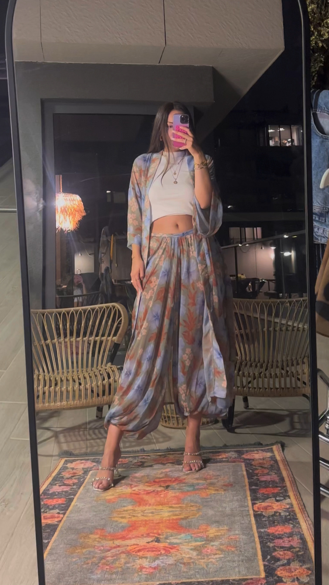 Mavi Çiçek Desenli Tül Şalvar Pantolon Kimono Takım