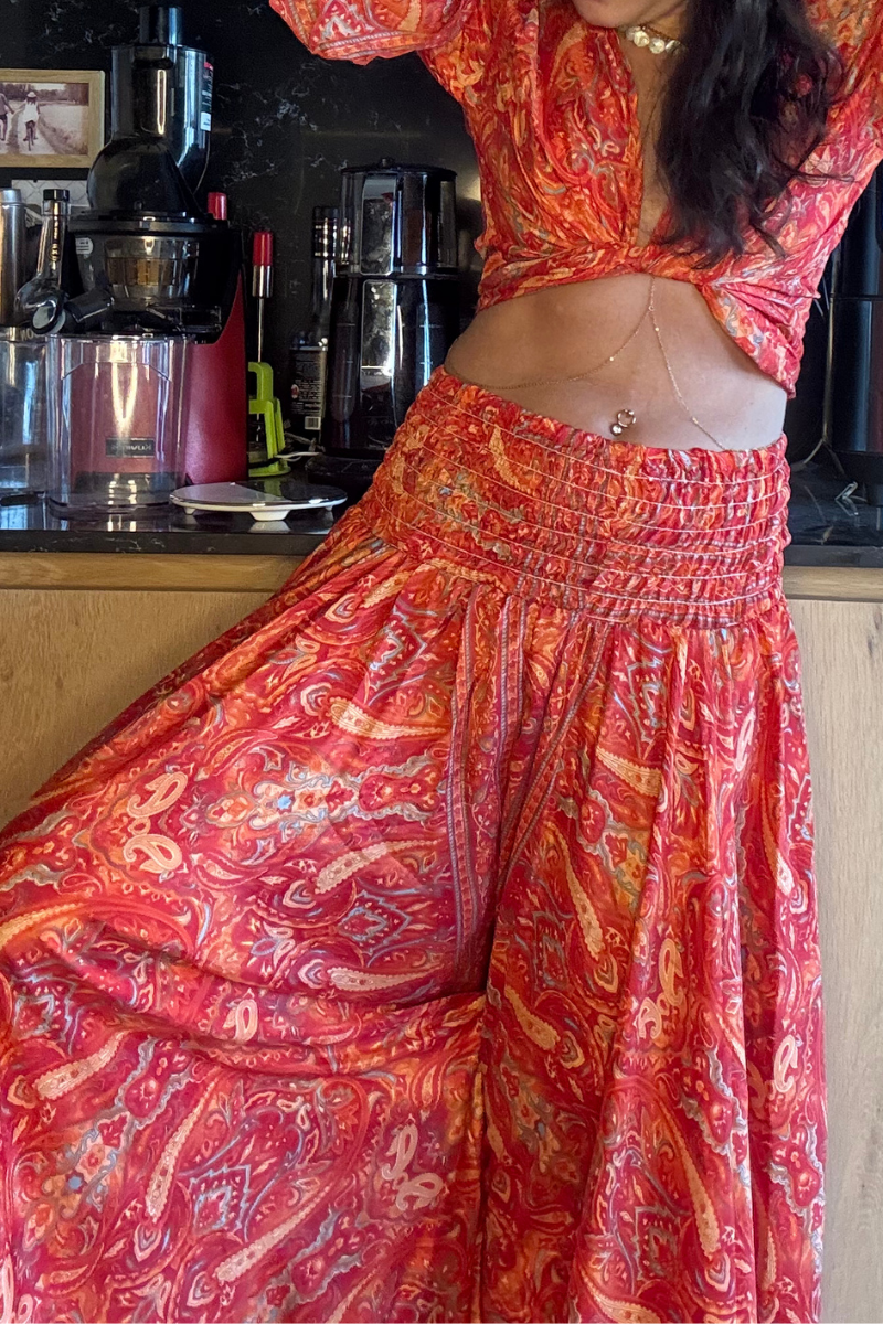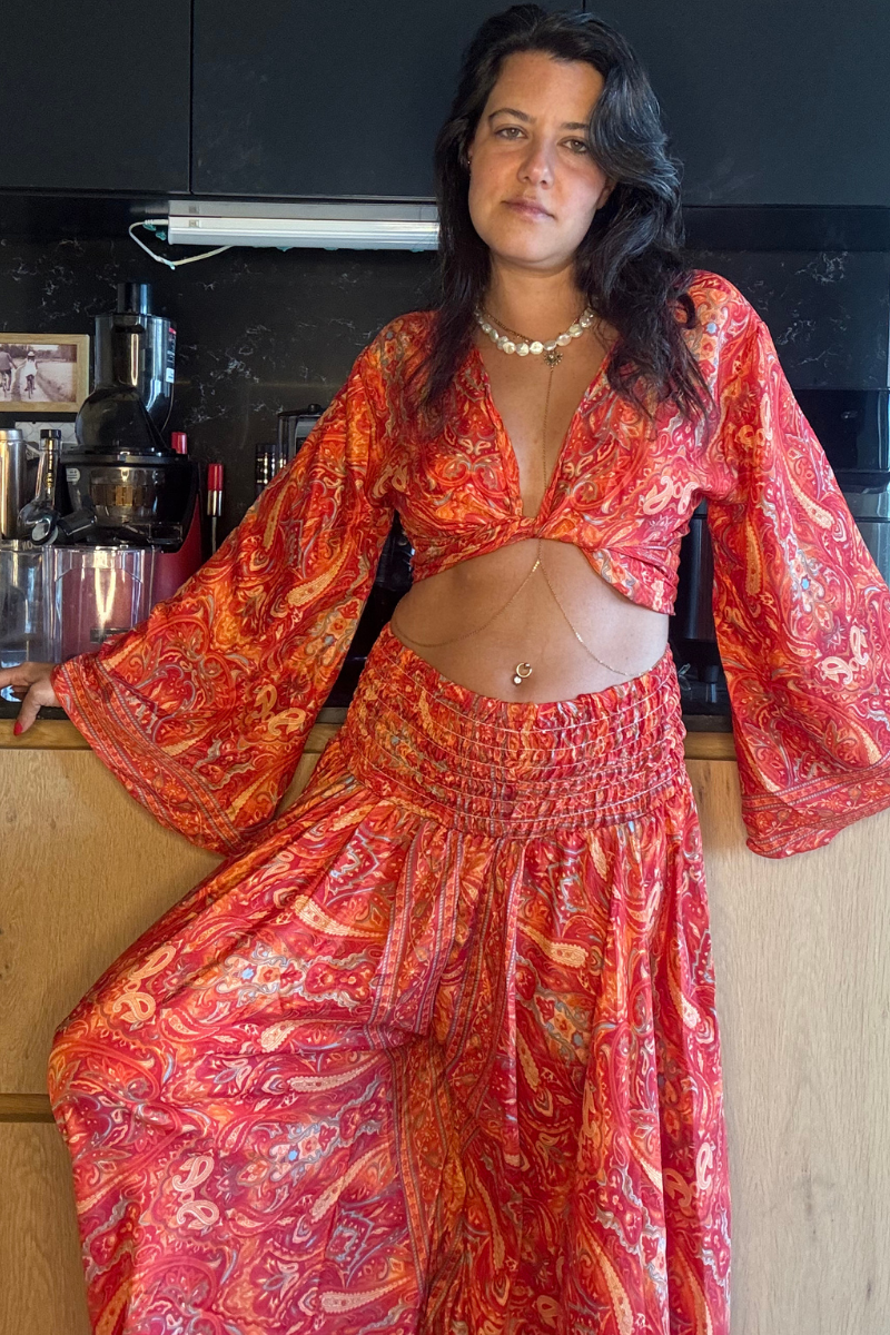 Mercan Renkli İthal İpek Bağlamalı Bolero ve Palazzo Pantolon