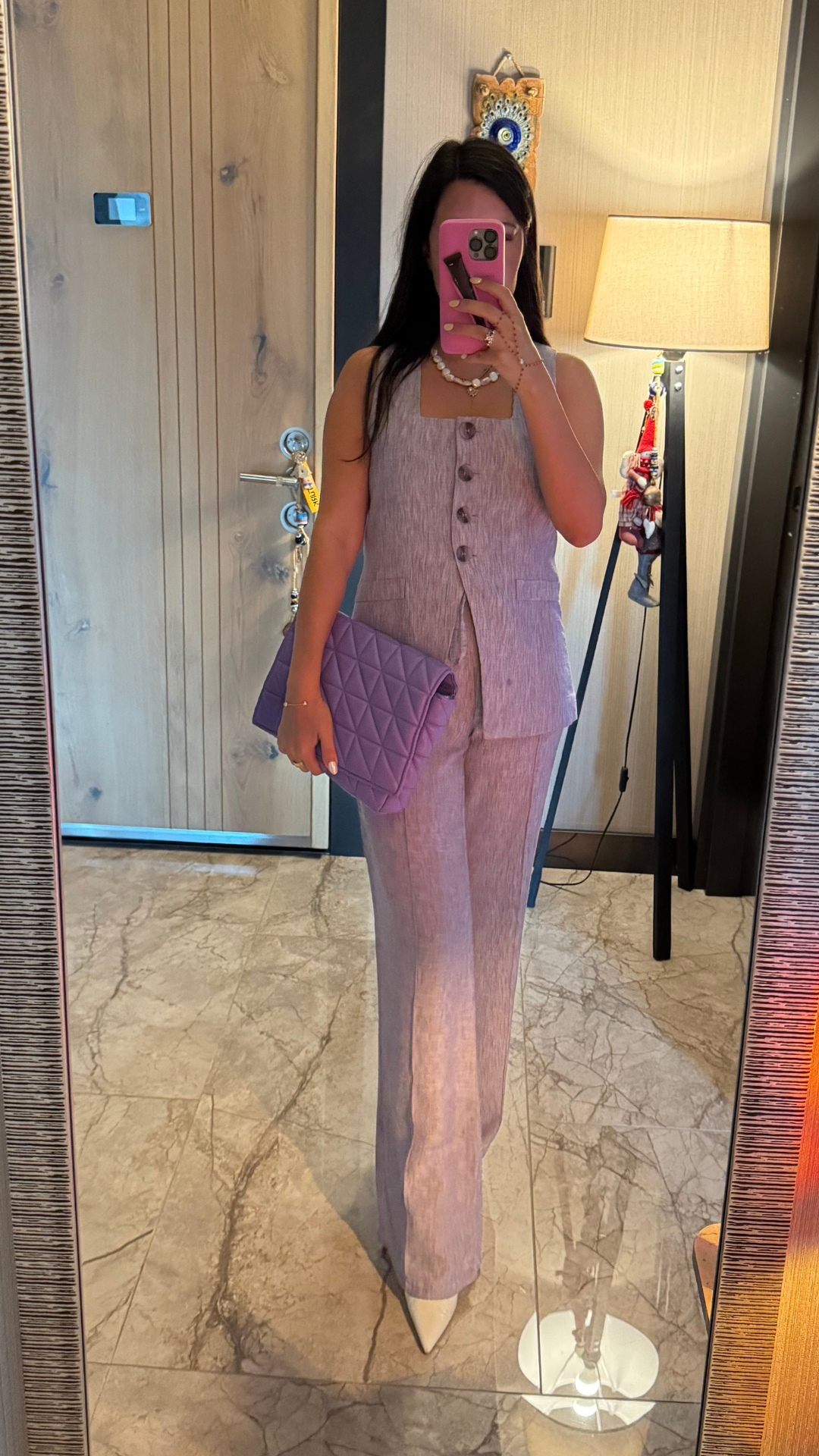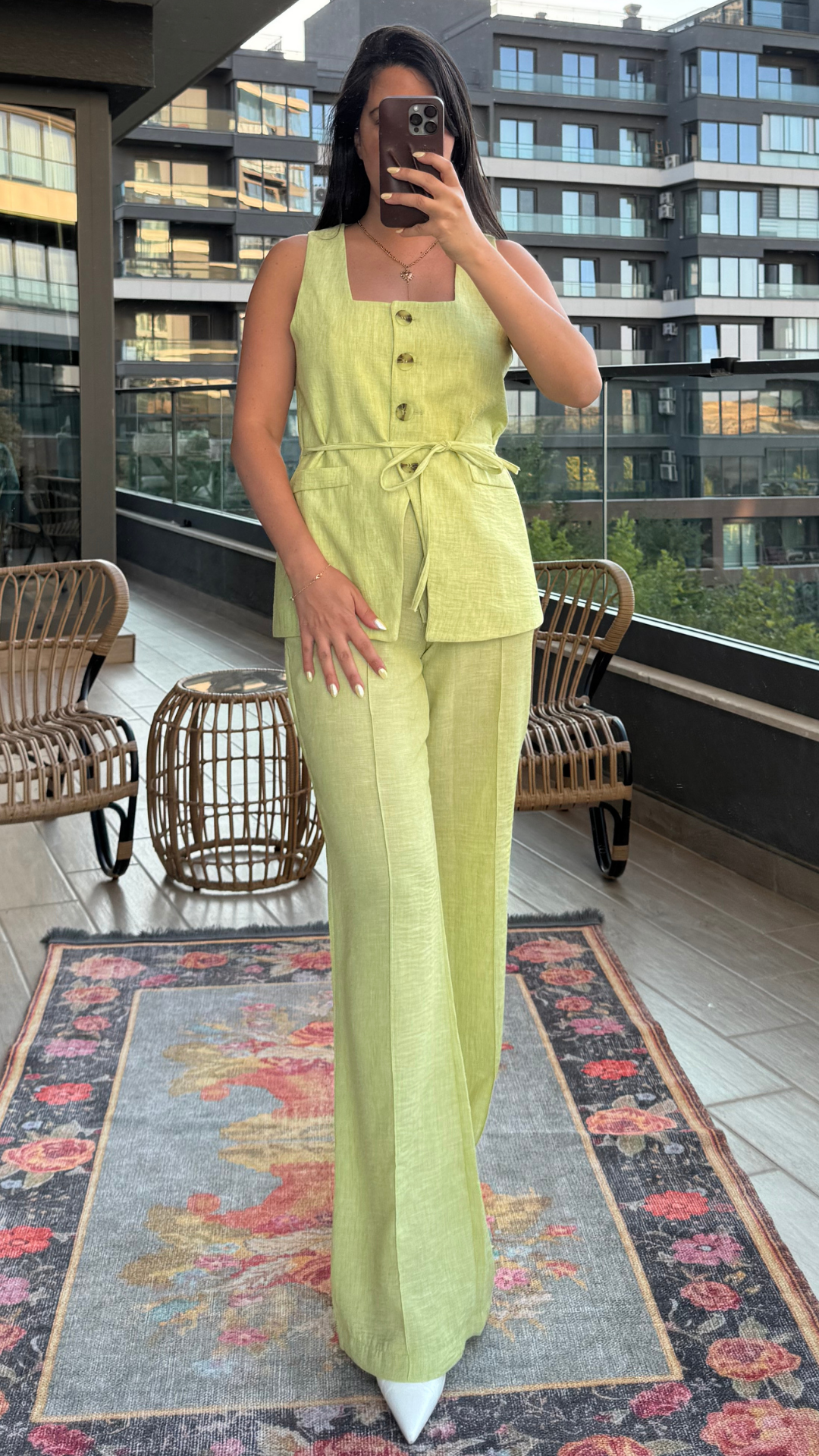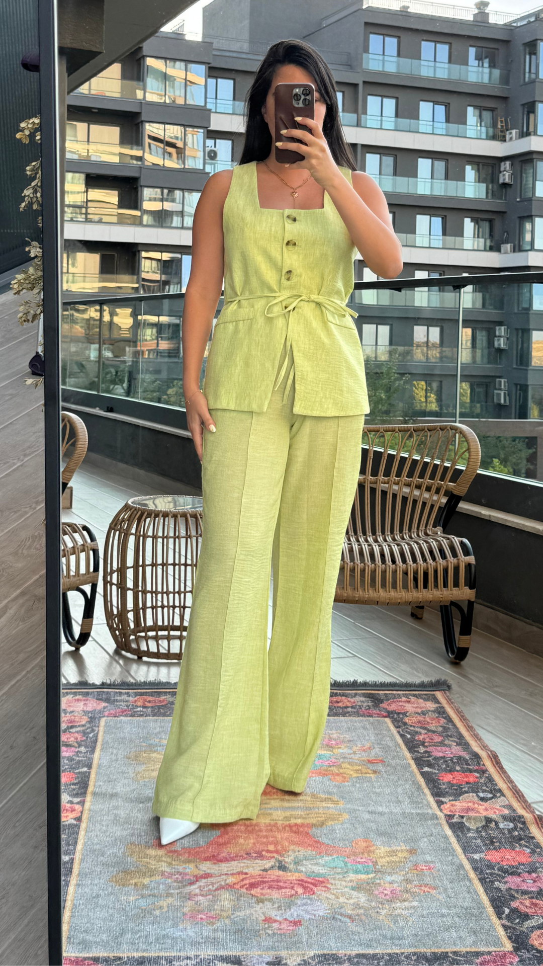 Fıstık Yeşili Yelek Pantolon Takım sıfır kollu, kare yaka önü düğmeli, belden bağlamalı, gizli cepli yelek