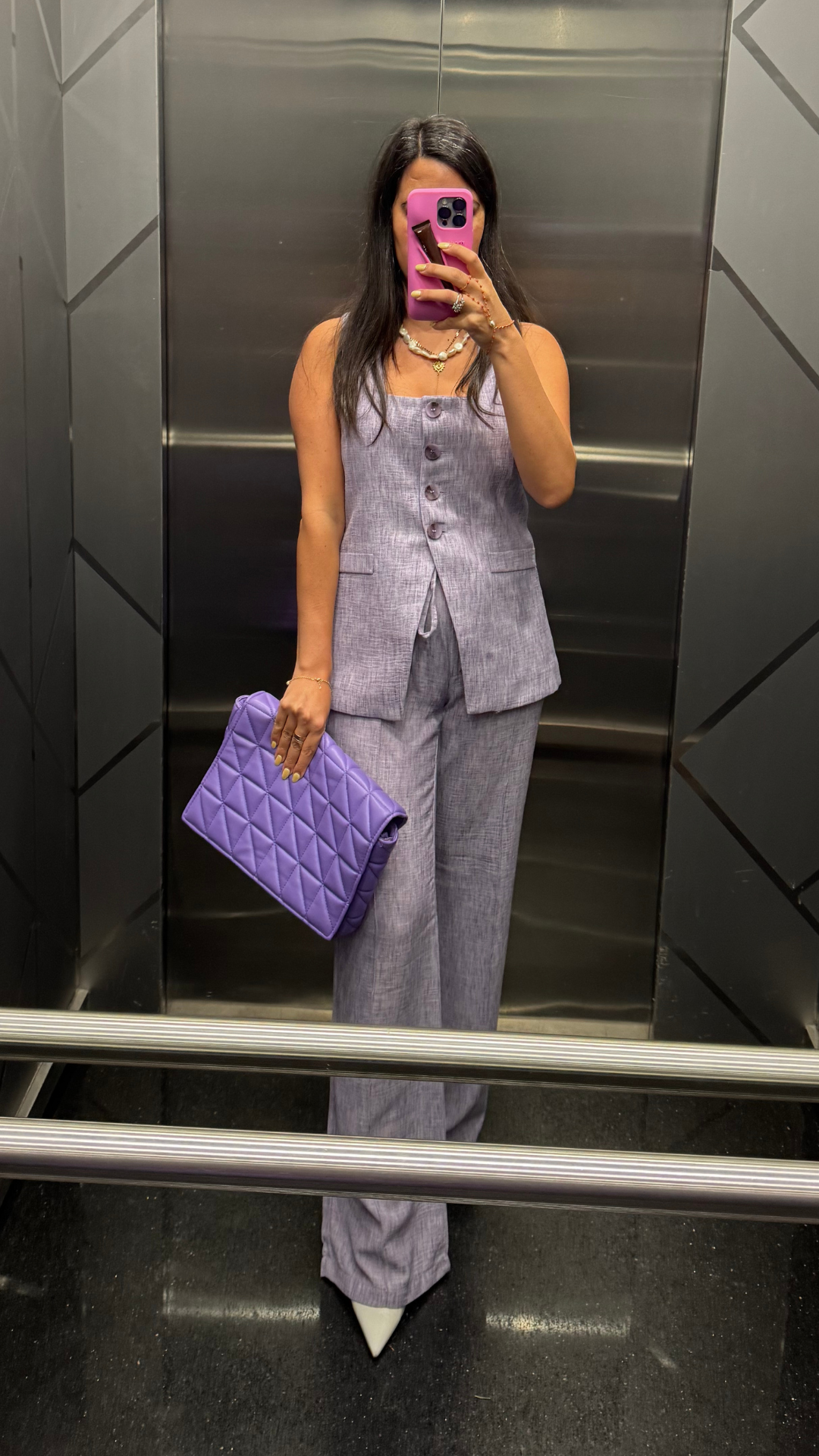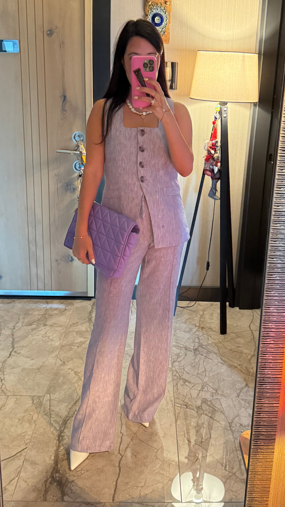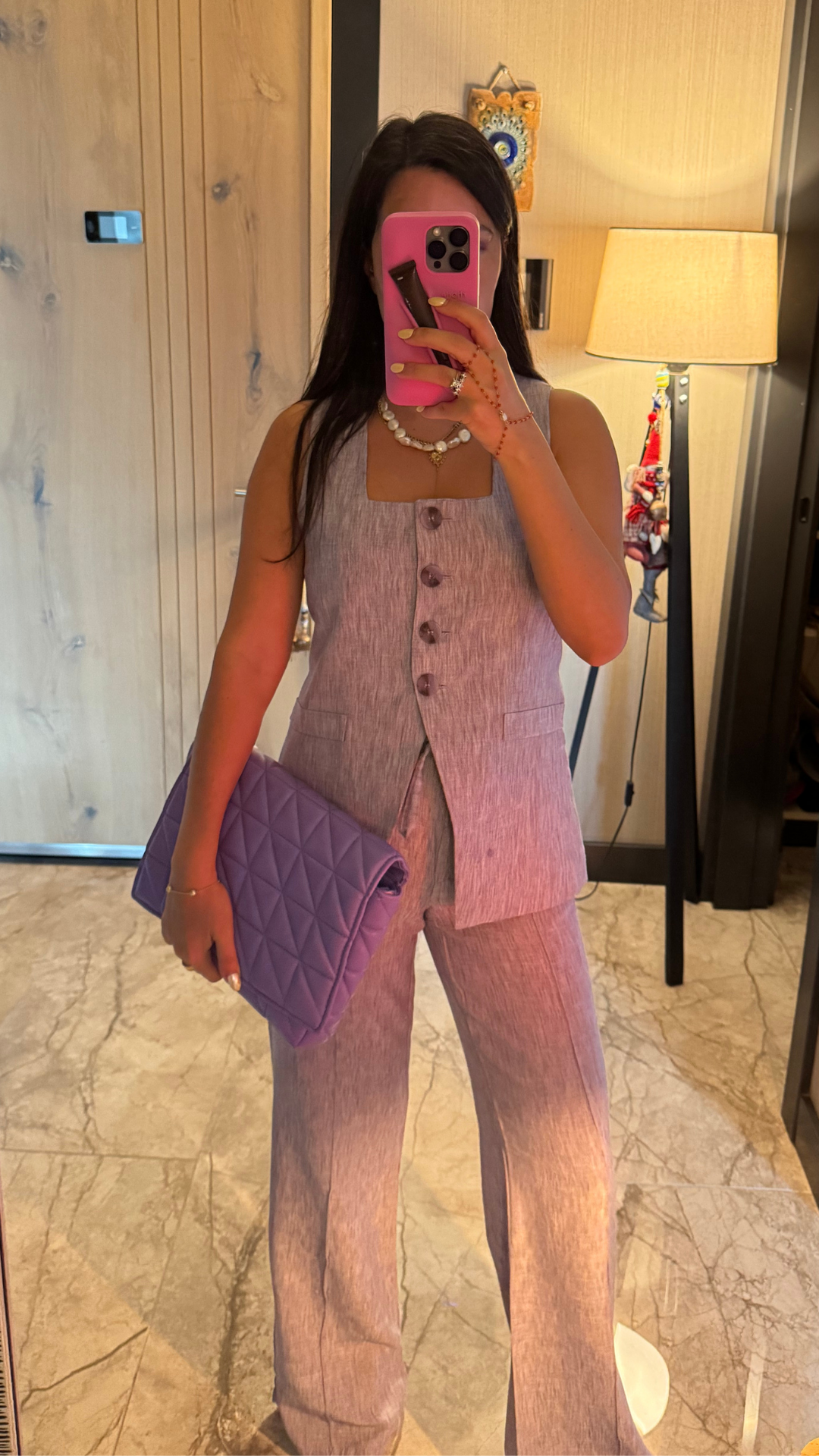 Fıstık Yeşili Yelek Pantolon Takım sıfır kollu, kare yaka önü düğmeli, belden bağlamalı, gizli cepli yelek