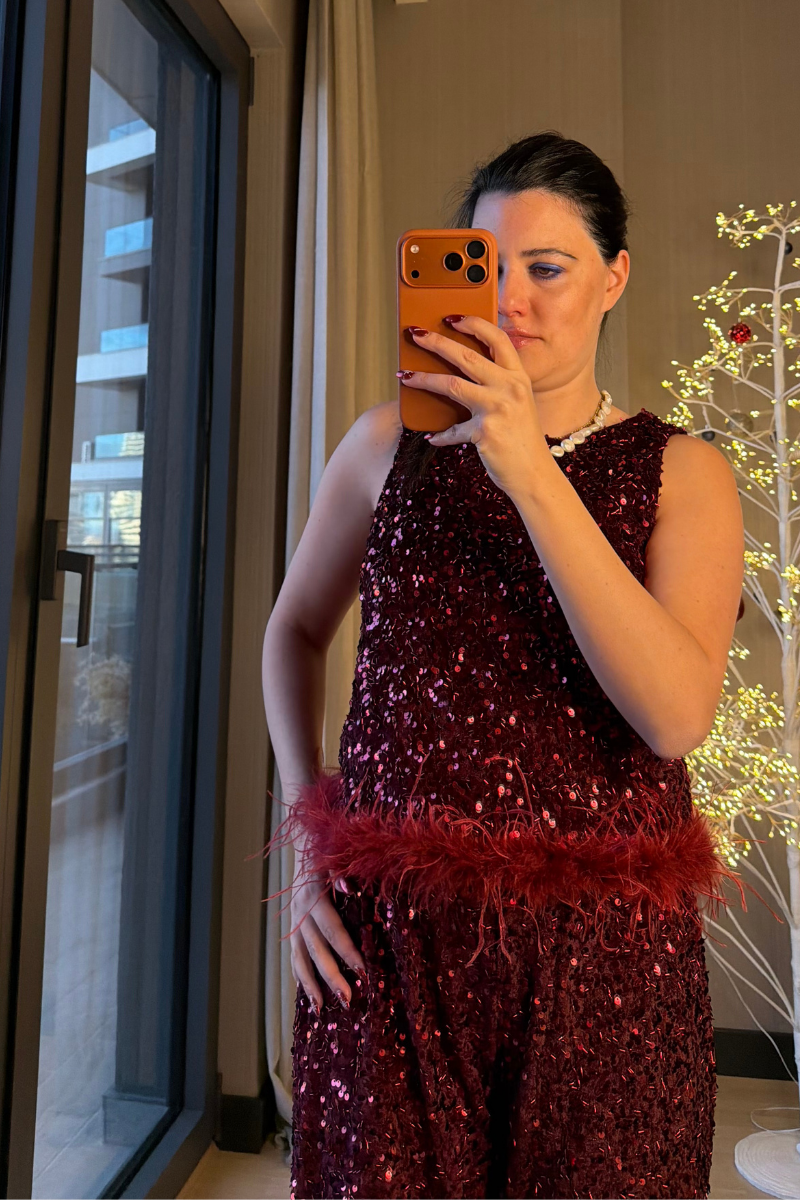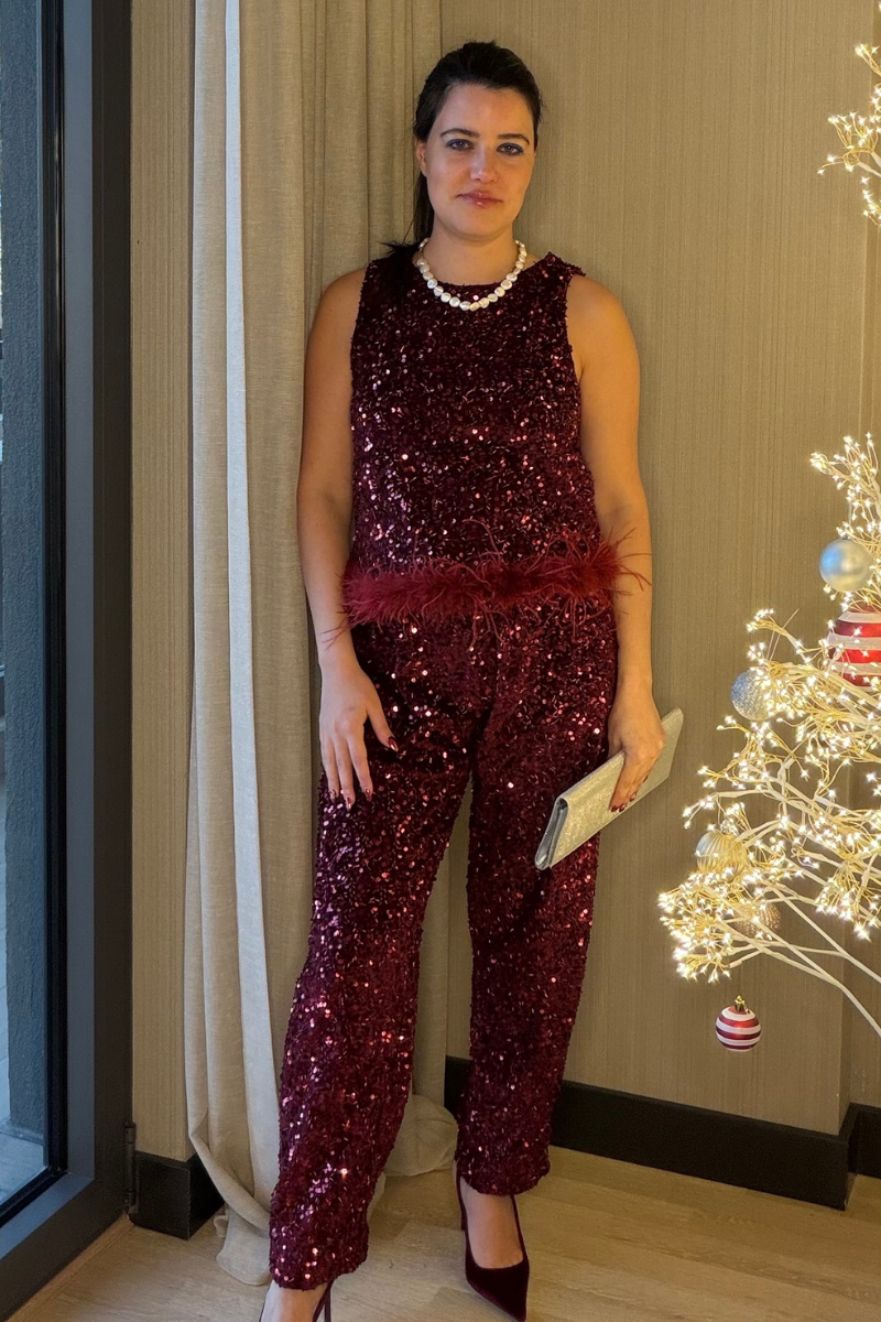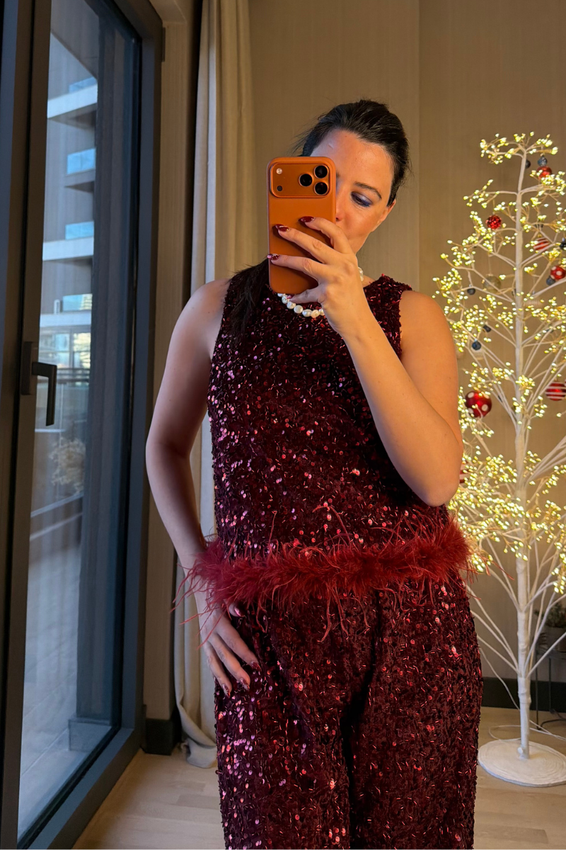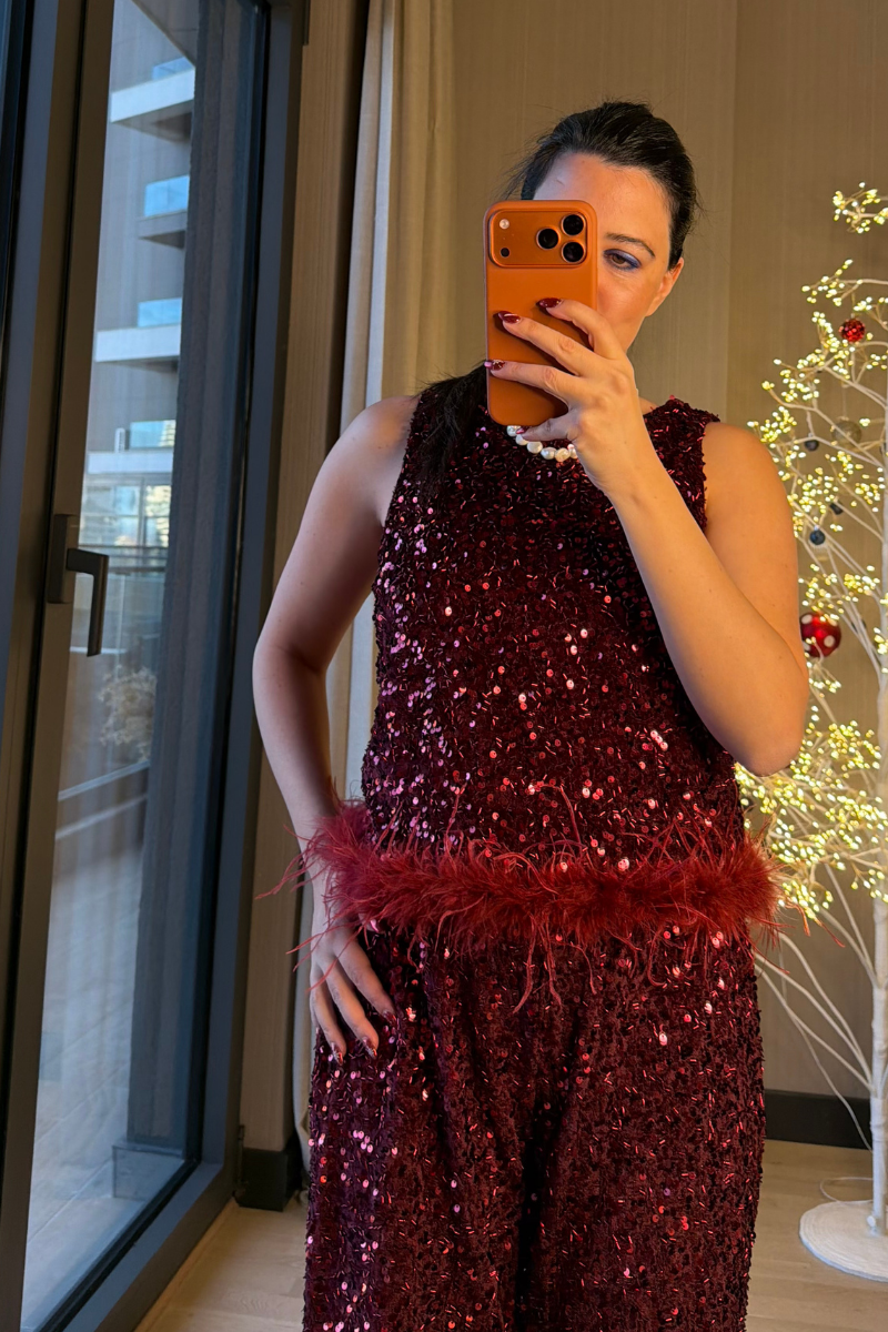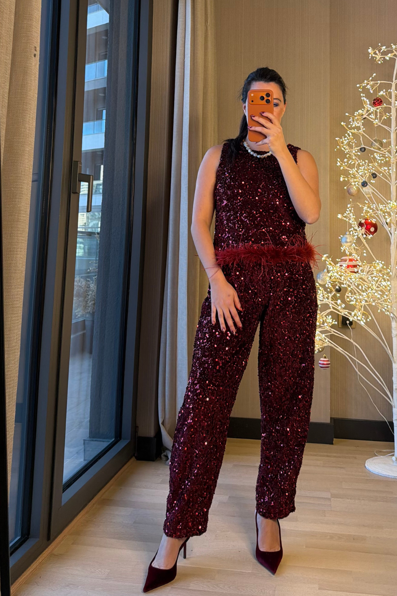 Otrişli Bluz ve Pul Payetli Pantolon Takım Bordo