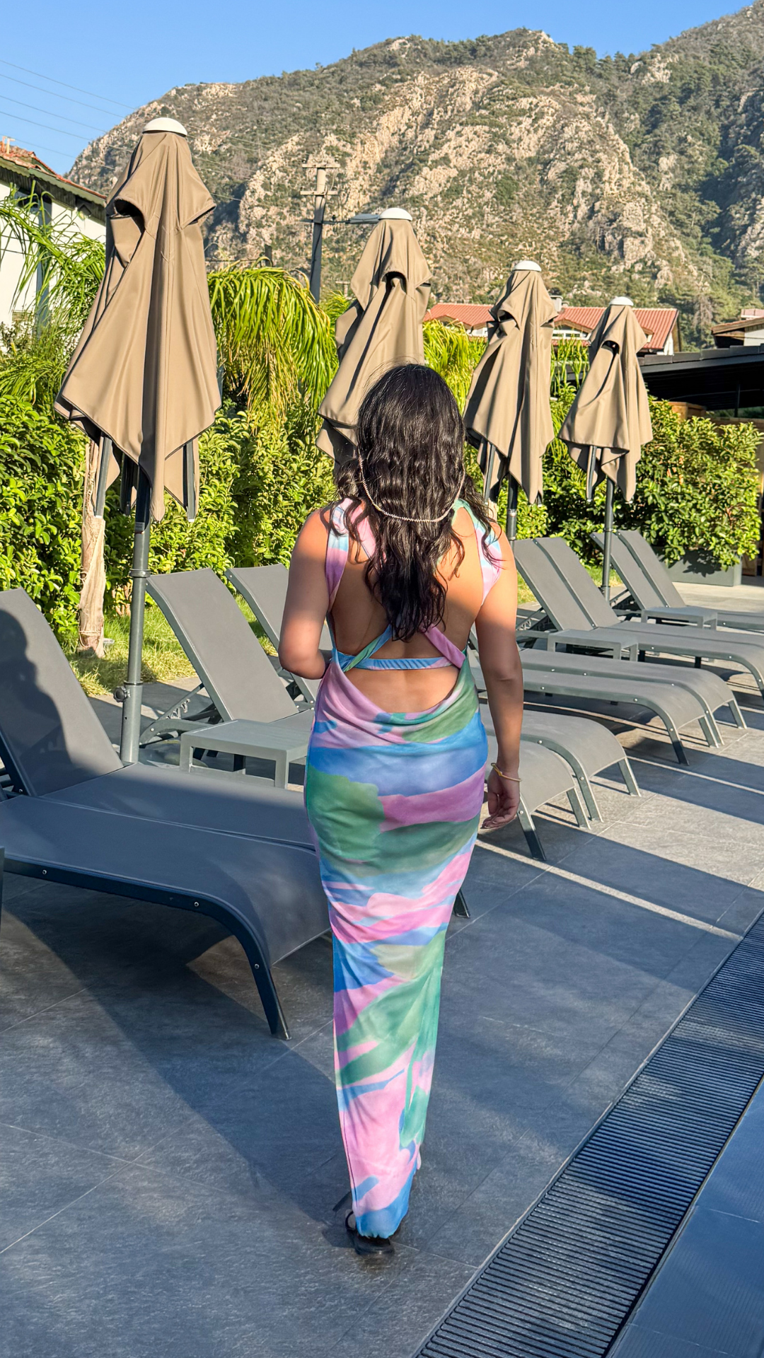 Renkli Kolsuz Tül Sırt Dekolteli Elbise