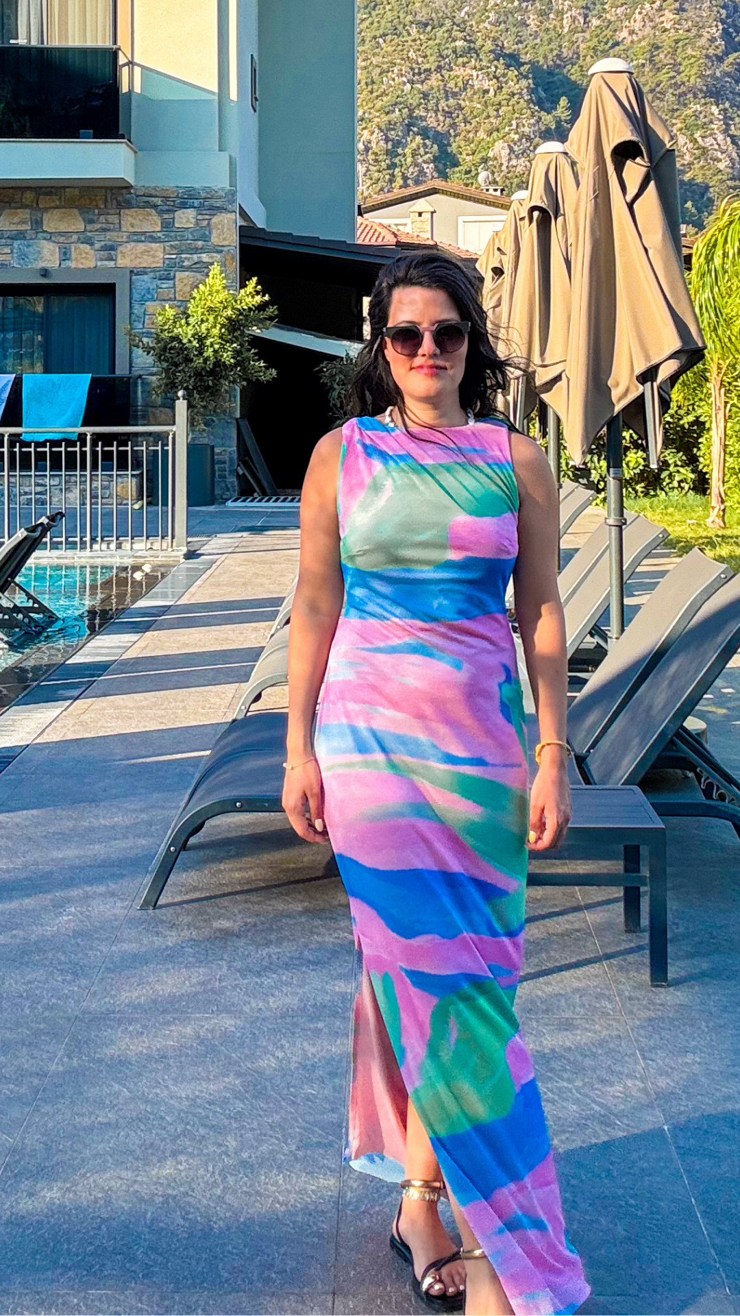 Renkli Kolsuz Tül Sırt Dekolteli Elbise. Normal Kalıp.