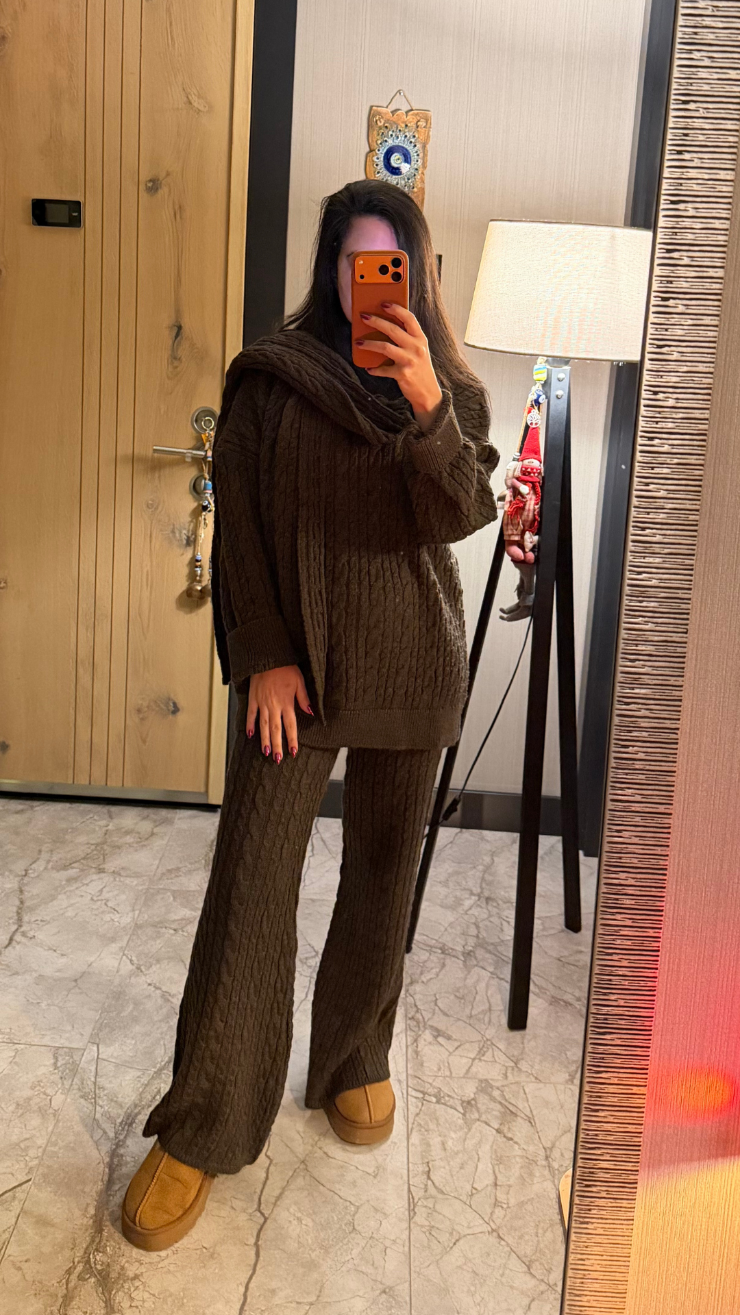 Şal Detaylı Örgü Eşofman Takım Kahverengi