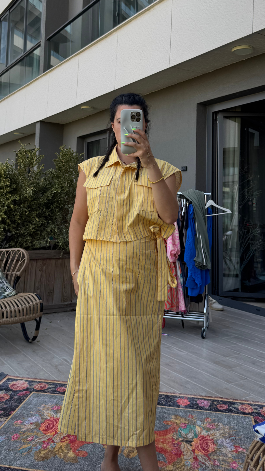 Sarı çizgili elbise önden iki parça gibi durur, göbek kısmı açıktır. Arka kısmı kapalıdır.