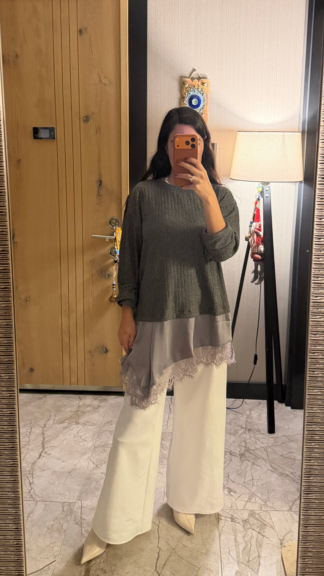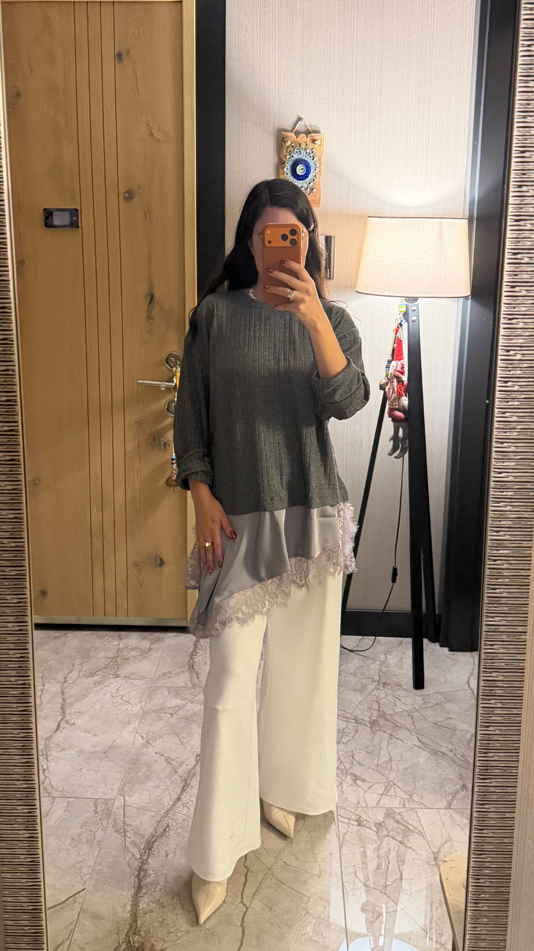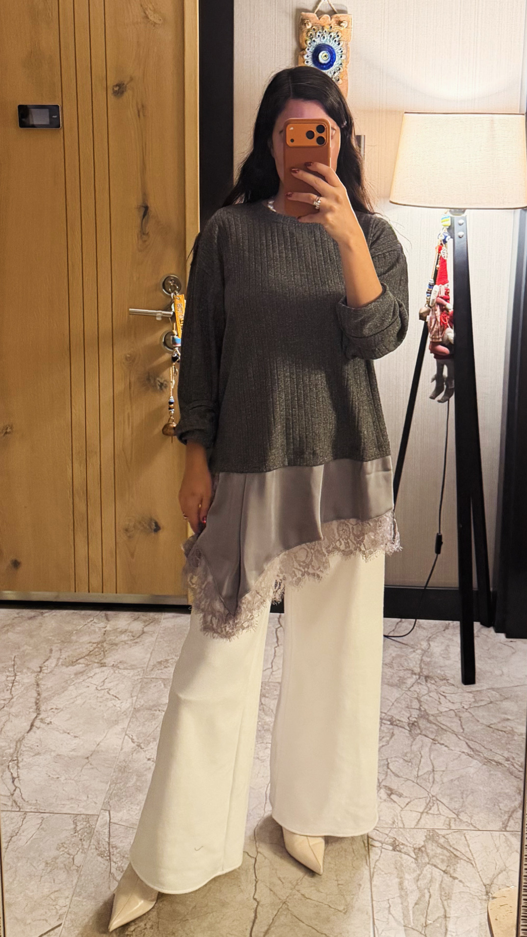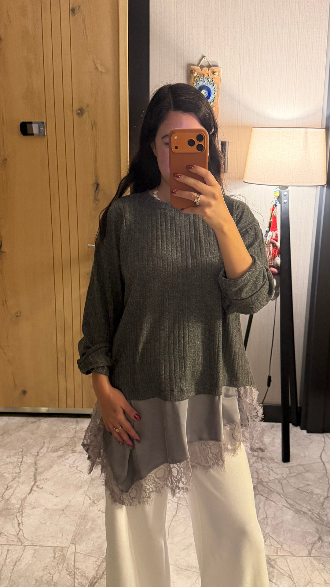 Dantel Saten Parçalı Triko Bluz / Elbise. Yanlarında yırtmaçları var, içine şort yada mini bir etekle giyilebilir.
