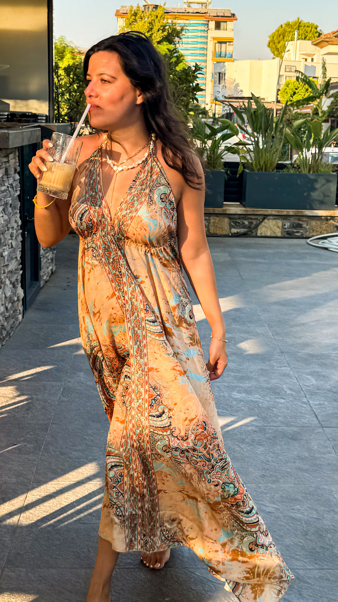 Sırt Dekolteli İşlemeli Somon Turkuaz İthal Elbise