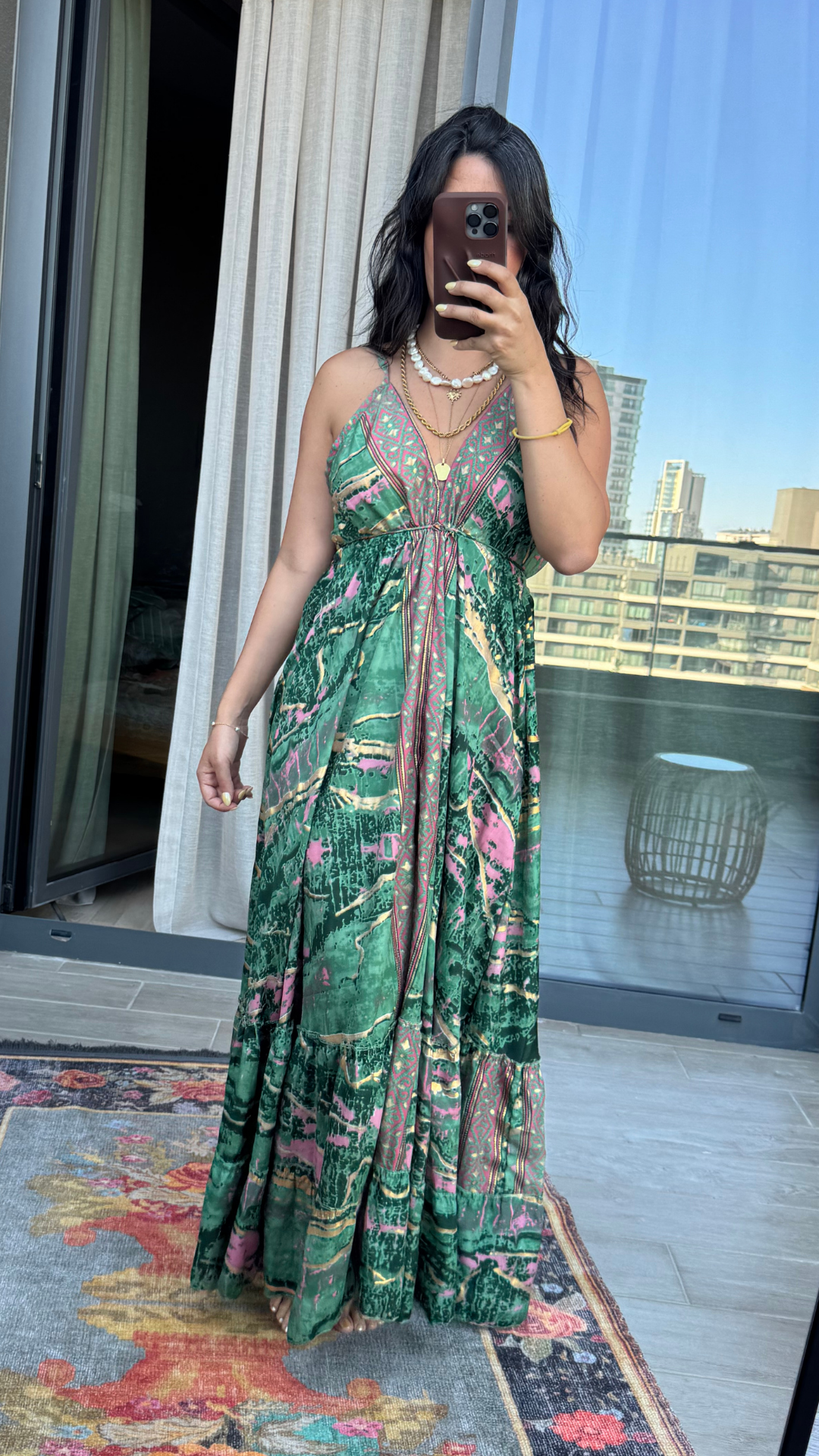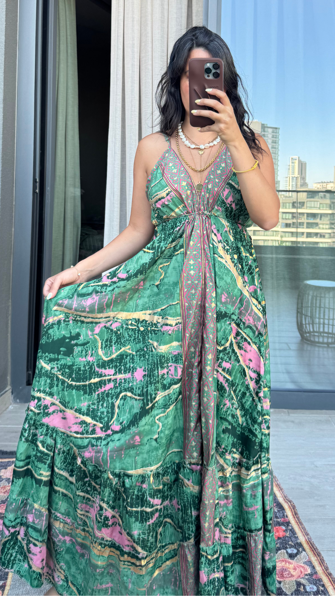 Sırt Dekolteli İşlemeli Yeşil Pembe İthal Elbise standart bedendir.