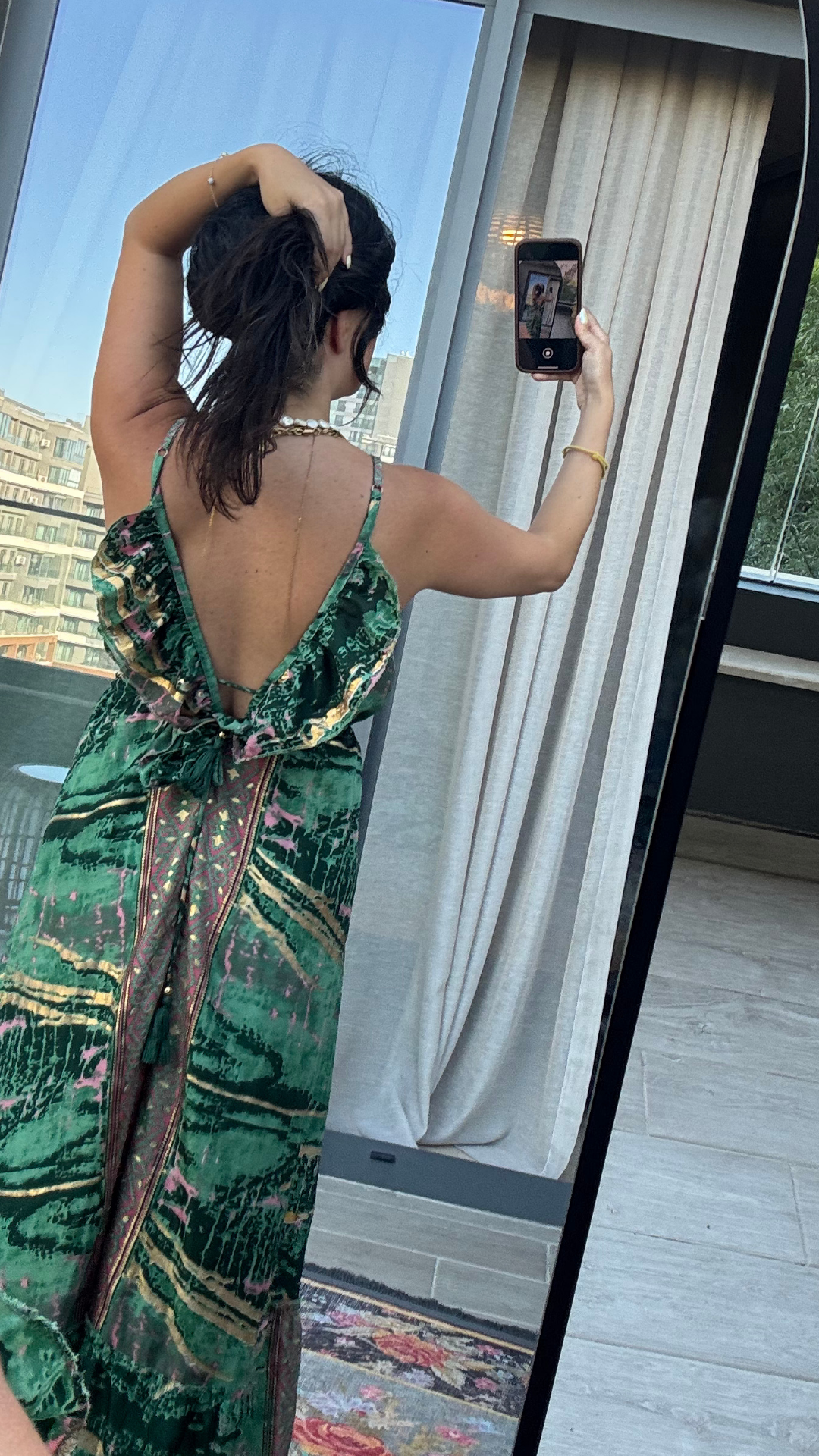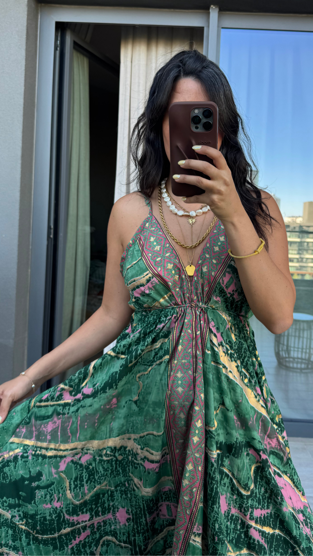 Sırt Dekolteli İşlemeli Yeşil Pembe İthal Elbise