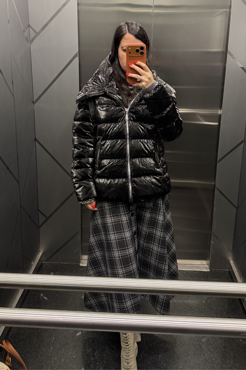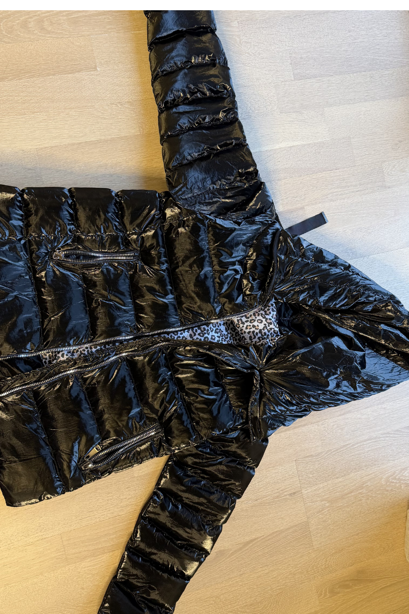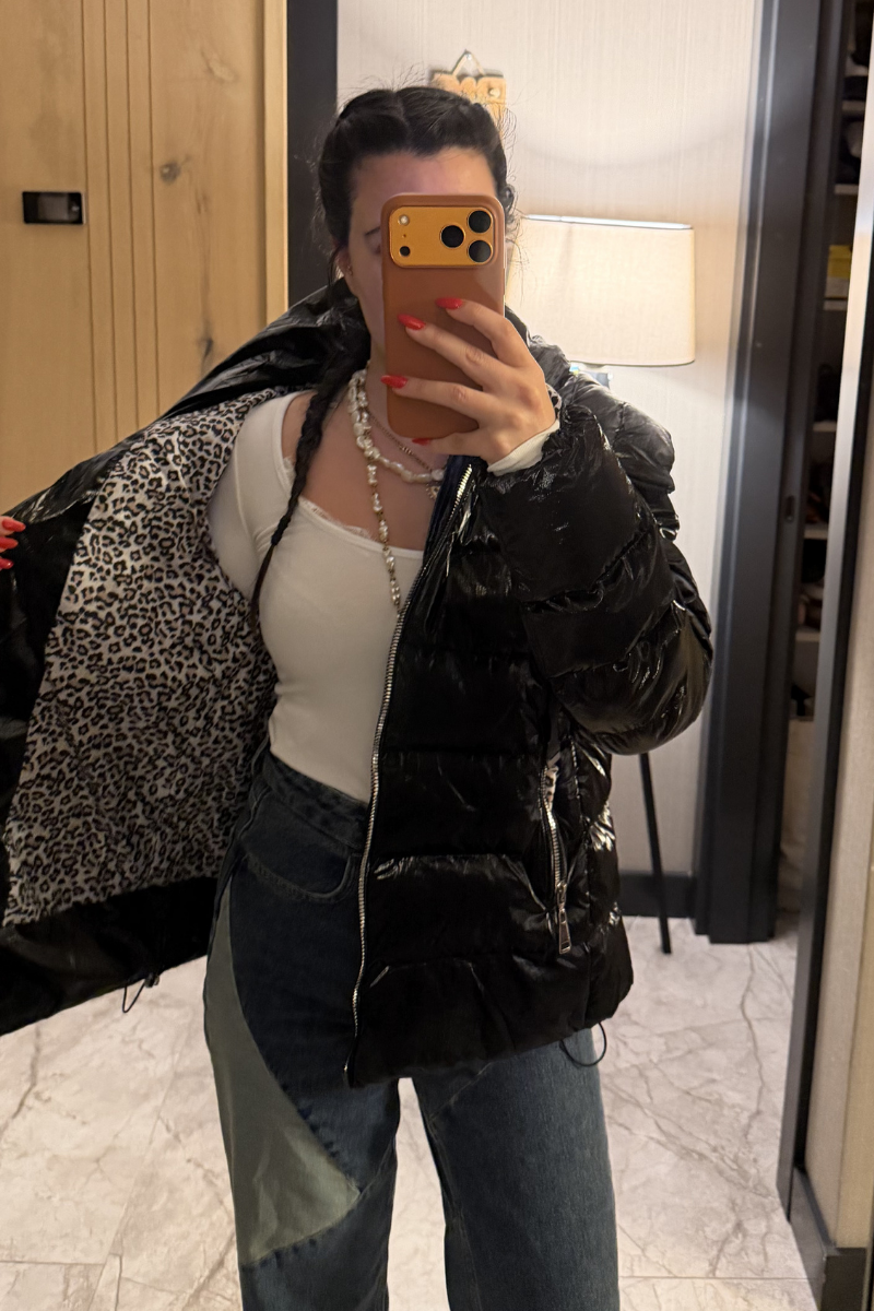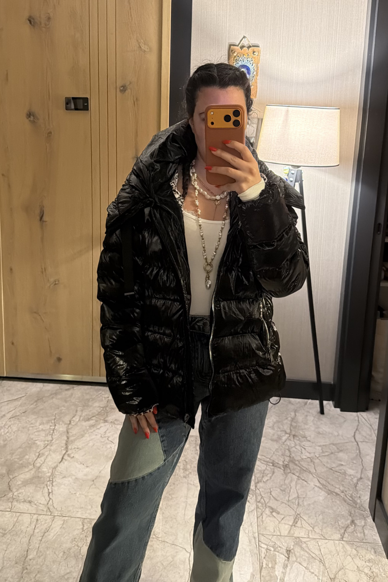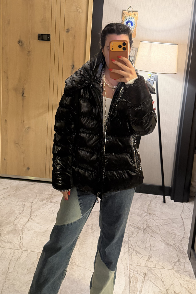 Siyah Kapüşonlu Parlak Mont içi astarlıdır.