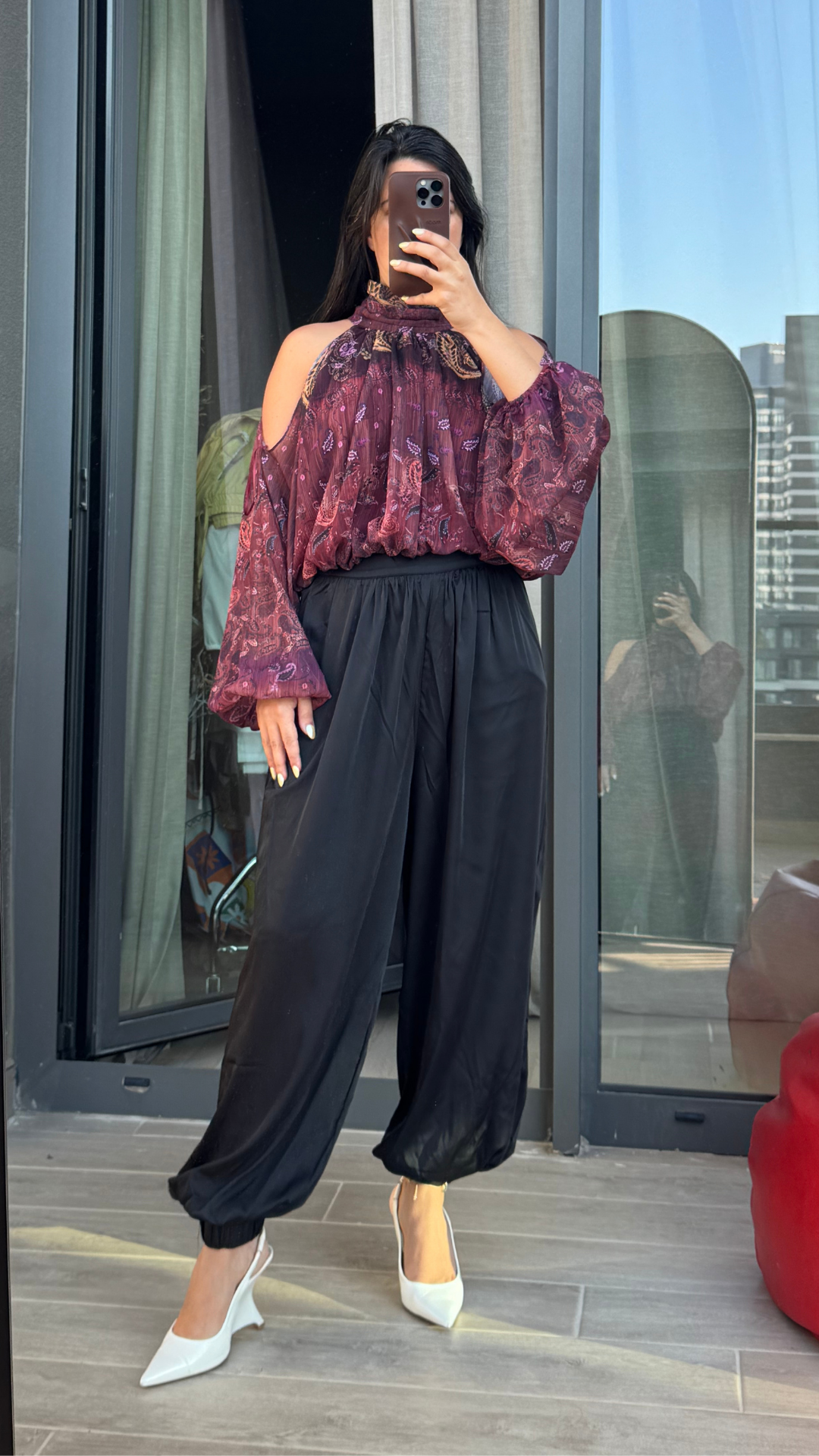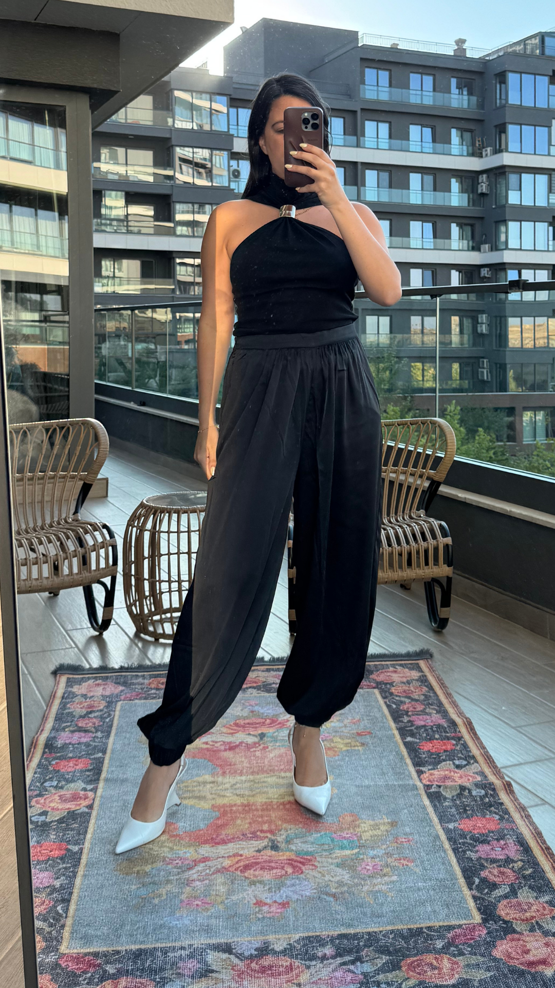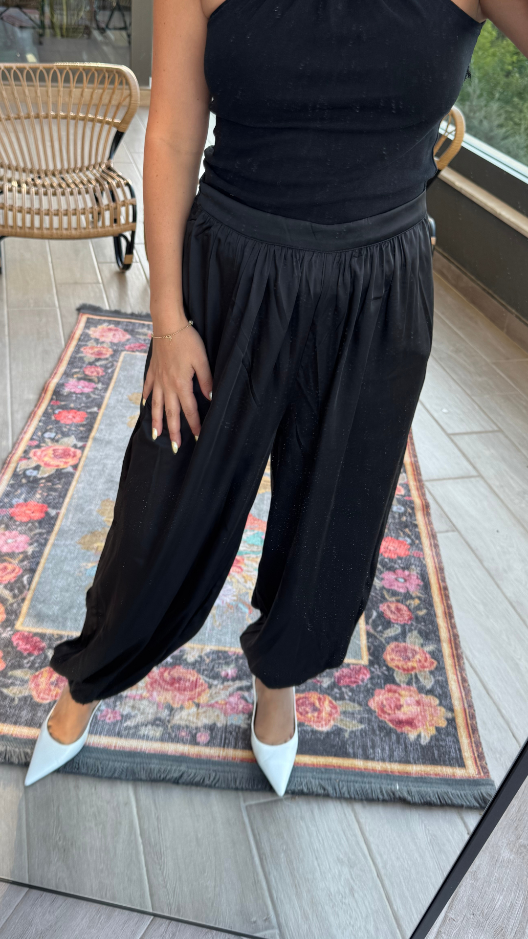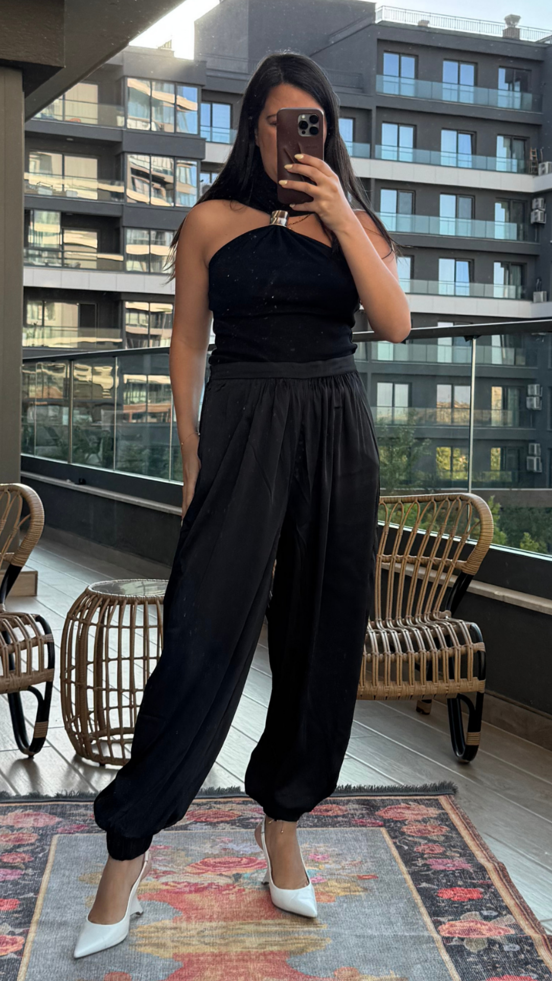 Siyah Saten Şalvar Pantolon rahat kesim bileklerden lastikli.