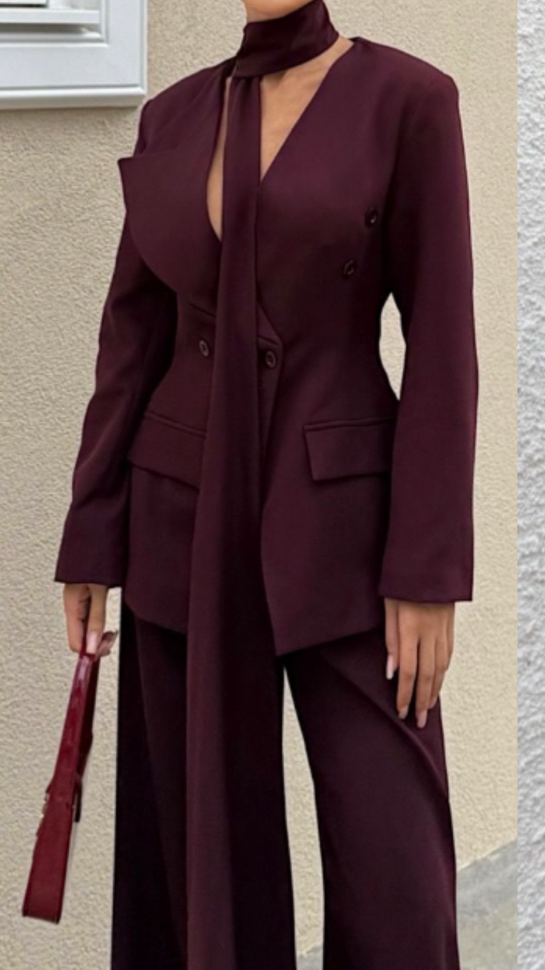 Boyundan düğme ile ayarlamalı uzun fularlı, bele oturan ceket, uzun palazzo pantolon.